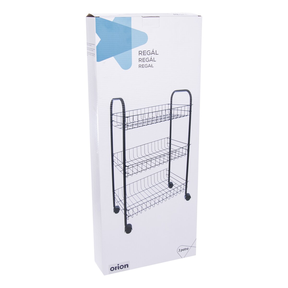 Kód produktu 810298Trojposchodový kovový regál na kolieskach na uloženie drobností v kuchyni, dielni aj na terase.