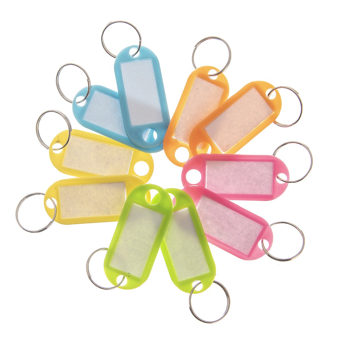 Súprava 10 ks žltých, oranžových ružových, zelených a modrých rozlišovacích visačiek ponúka možnosť popisu.