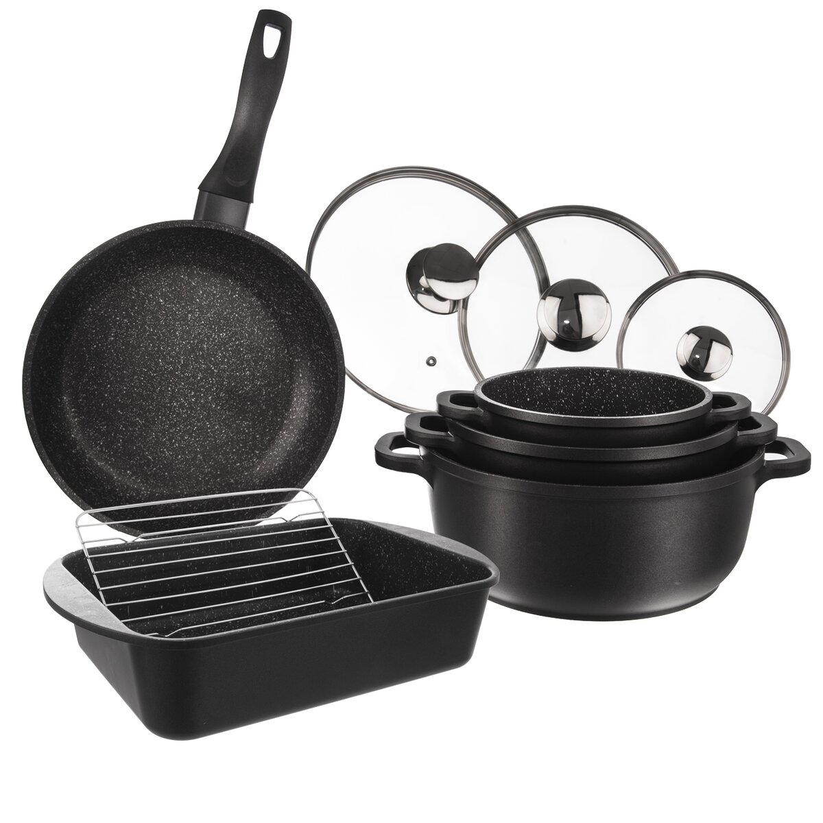 Kód produktu 113127Sada troch hrncov GRANDE so sklenenou pokrievkou, pekáč s roštom a panvica s nepriľnavým povrchom je vhodná okrem pekáča na všetky typy sporákov, hrnce a pekáč aj do rúry.