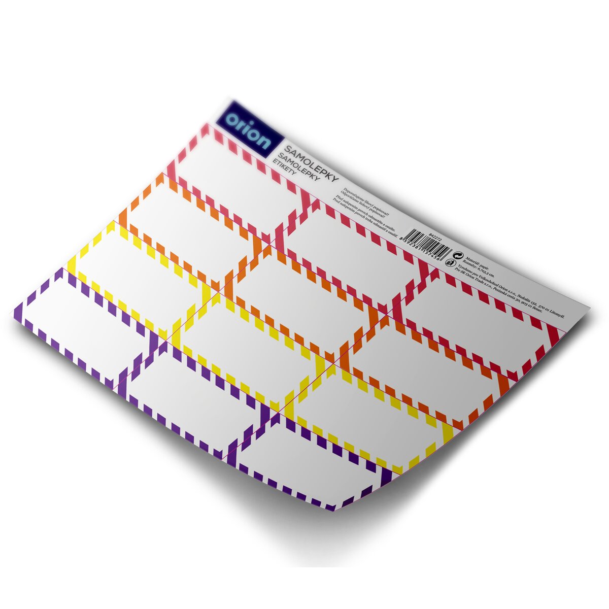 Kód produktu 842272Sada12 papierových obdĺžnikových samolepiek určených na popísanie. Každá z nich má farebný rámček a rozmery 7,3×3,5 cm.