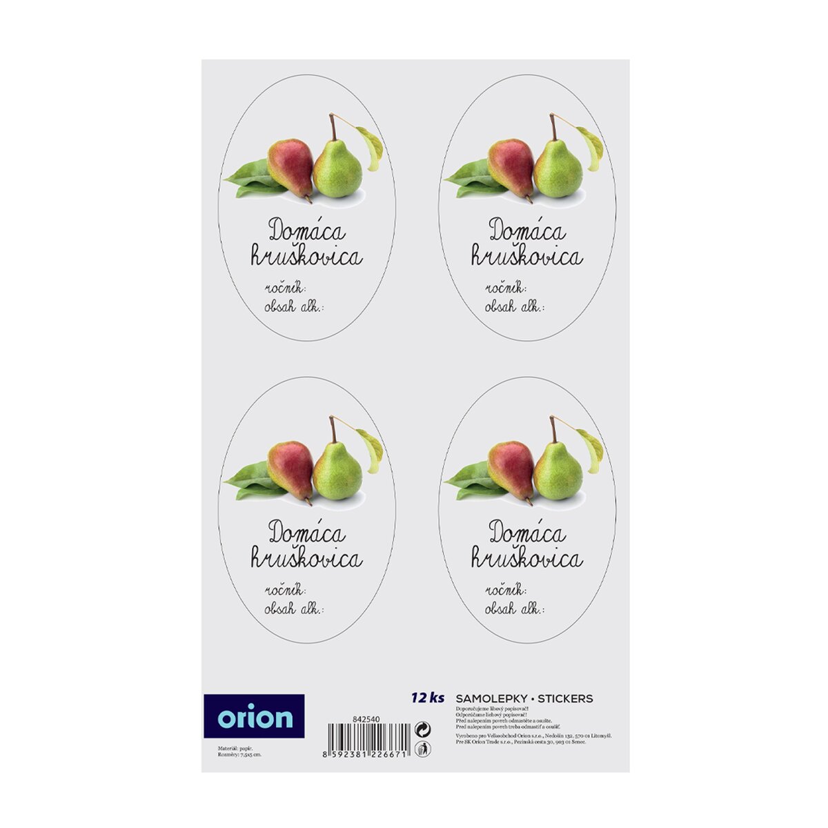 Kód produktu 842540Sada 12 kusov papierových samolepiek je doplnená obrázkom hrušiek a priestorom na označenie roku výroby hruškovice a obsahu alkoholu. Jedna oválna samolepka má rozmer 7,5x5 cm.