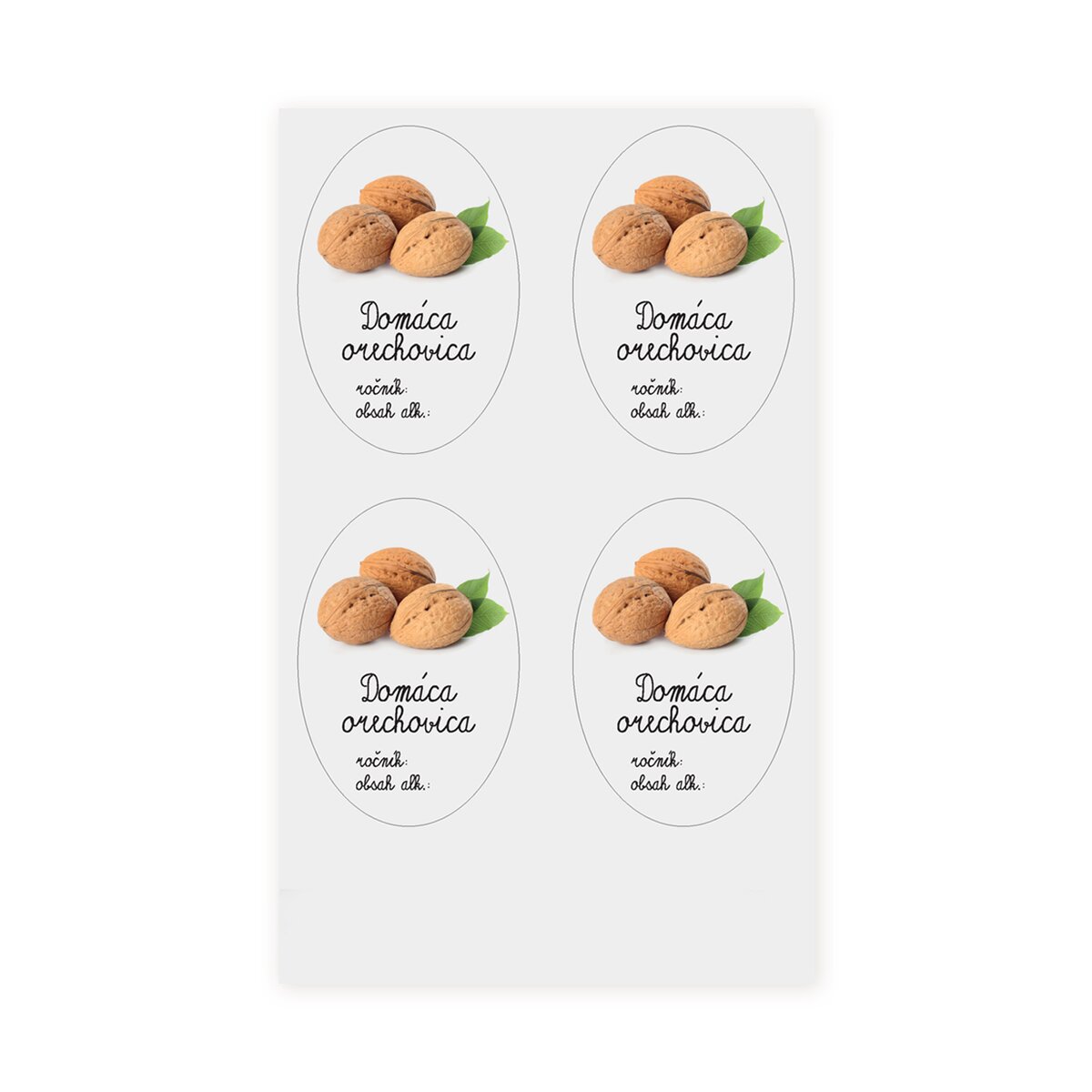 Kód produktu 842543Sada 12 kusov papierových samolepiek je doplnená obrázkom vlašských orechov a priestorom na označenie roku výroby a obsahu alkoholu. Jedna oválna samolepka má rozmer 7,5x5 cm.
