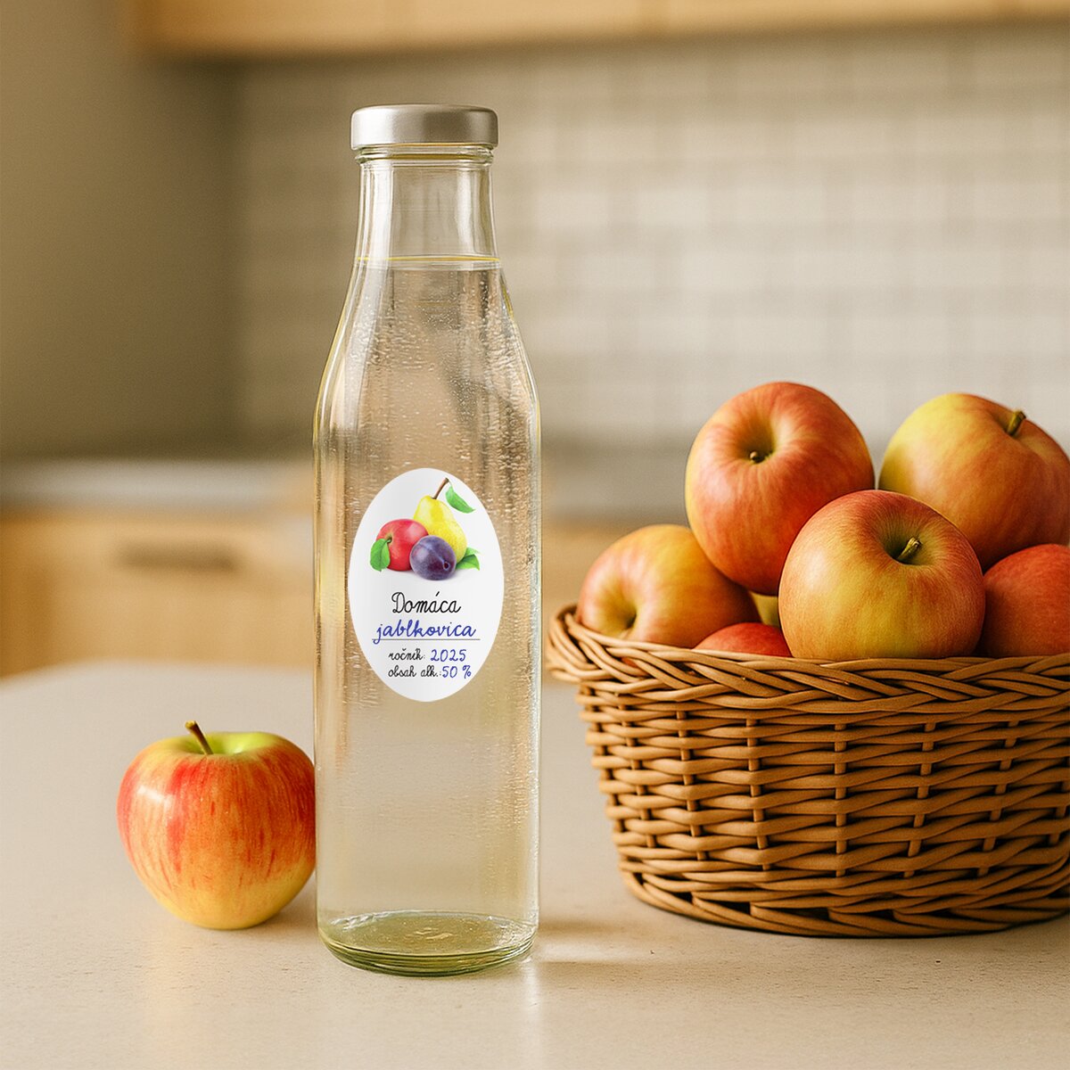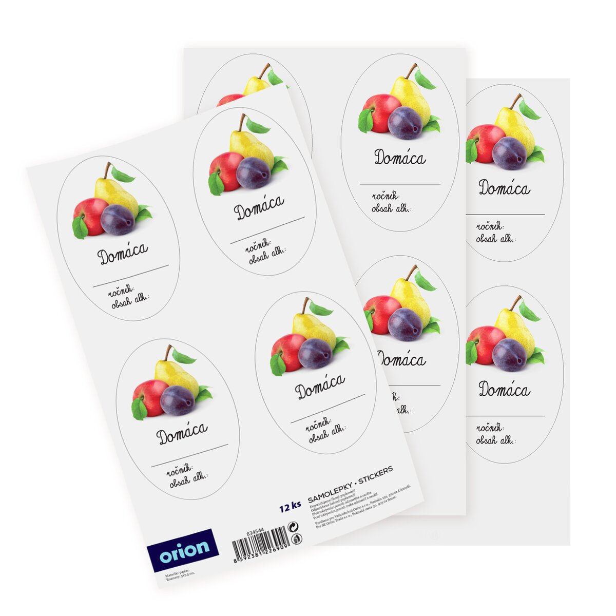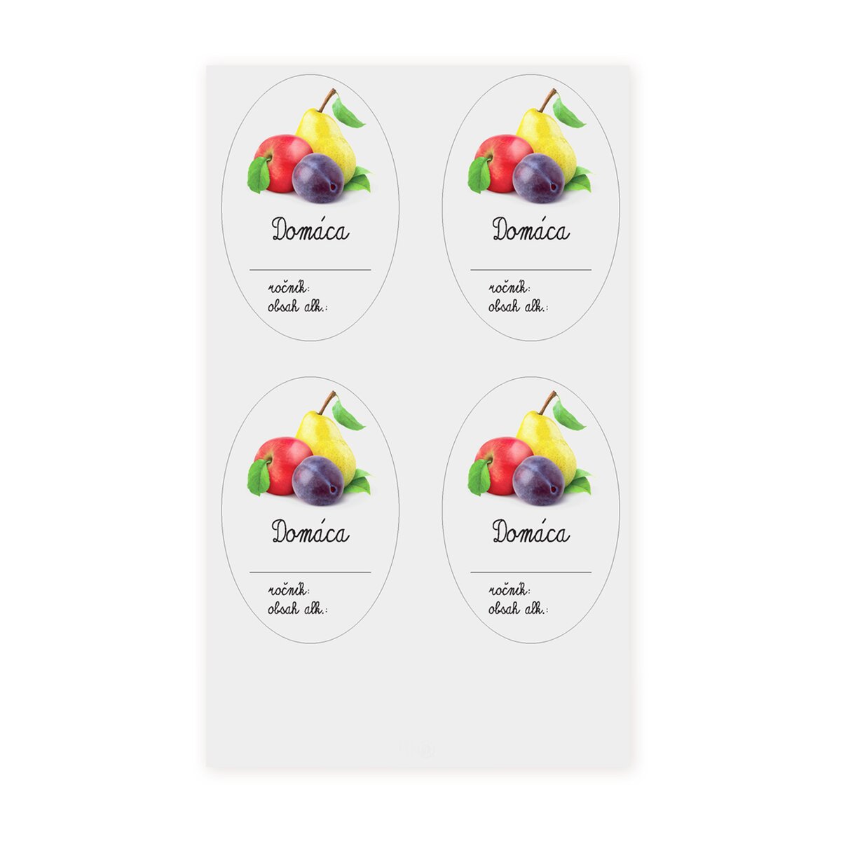 Kód produktu 842544Sada 12 kusov univerzálnych papierových samolepiek je doplnená obrázkom ovocia a priestorom na označenie roku výroby a obsahu alkoholu. Jedna oválna samolepka má rozmer 7,5x5 cm.