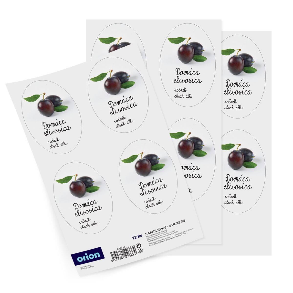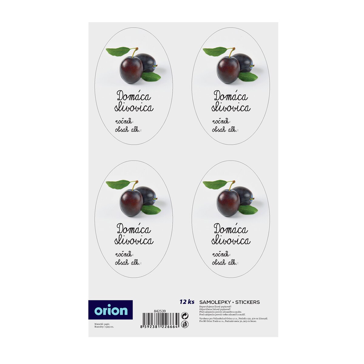 Kód produktu 842539Sada 12 kusov papierových samolepiek s obrázkom a popisom DOMÁCA SLIVOVICA. Rozmer jednej oválnej samolepky je 5x7,5 cm.