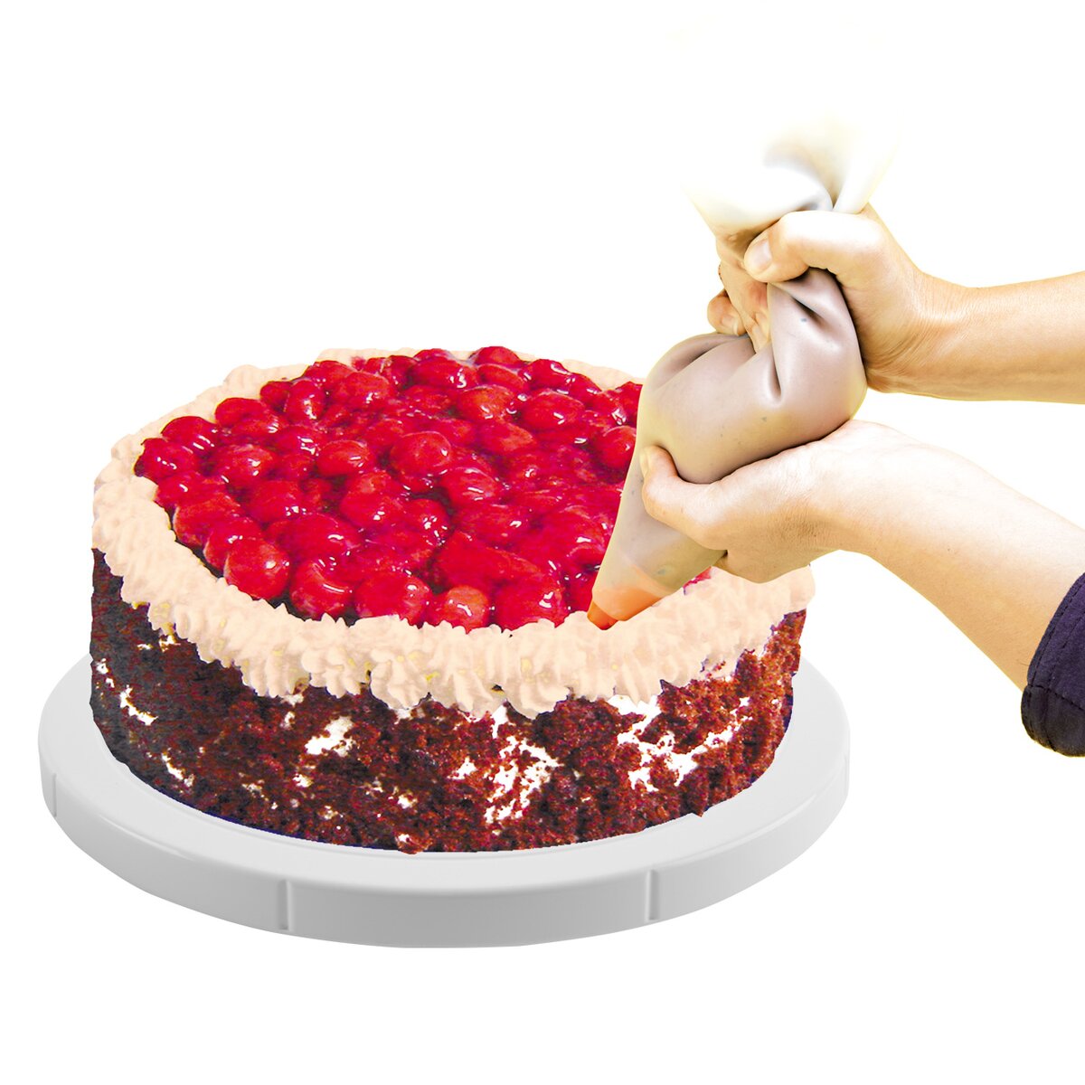Kód produktu 540556Plastový otočný stojan s priemerom 27 cm v bielej farbe, určený na zdobenie a servírovanie tort alebo vyhladzovanie poťahovanej hmoty.