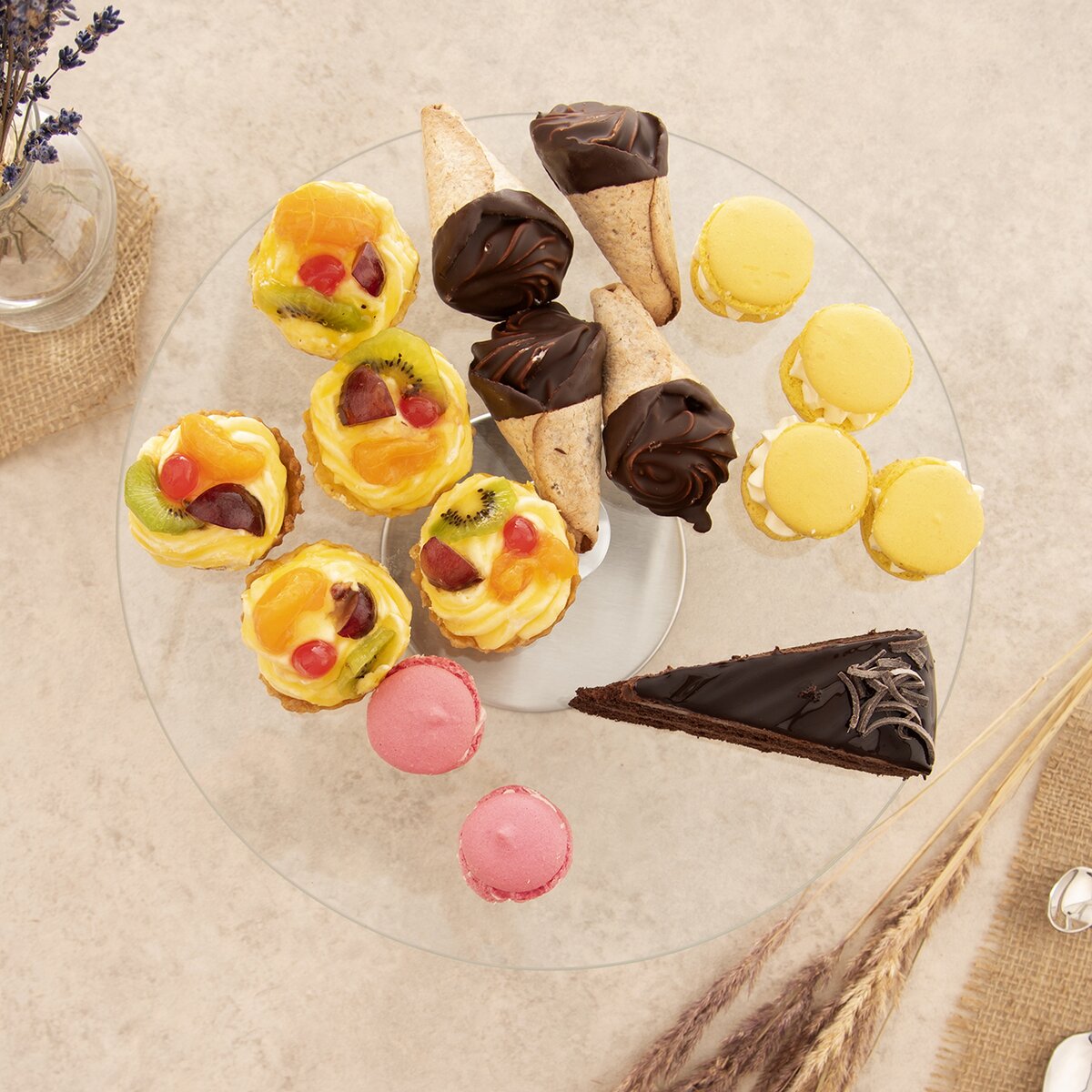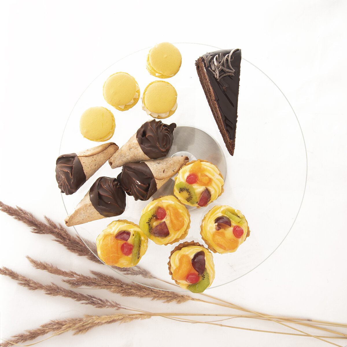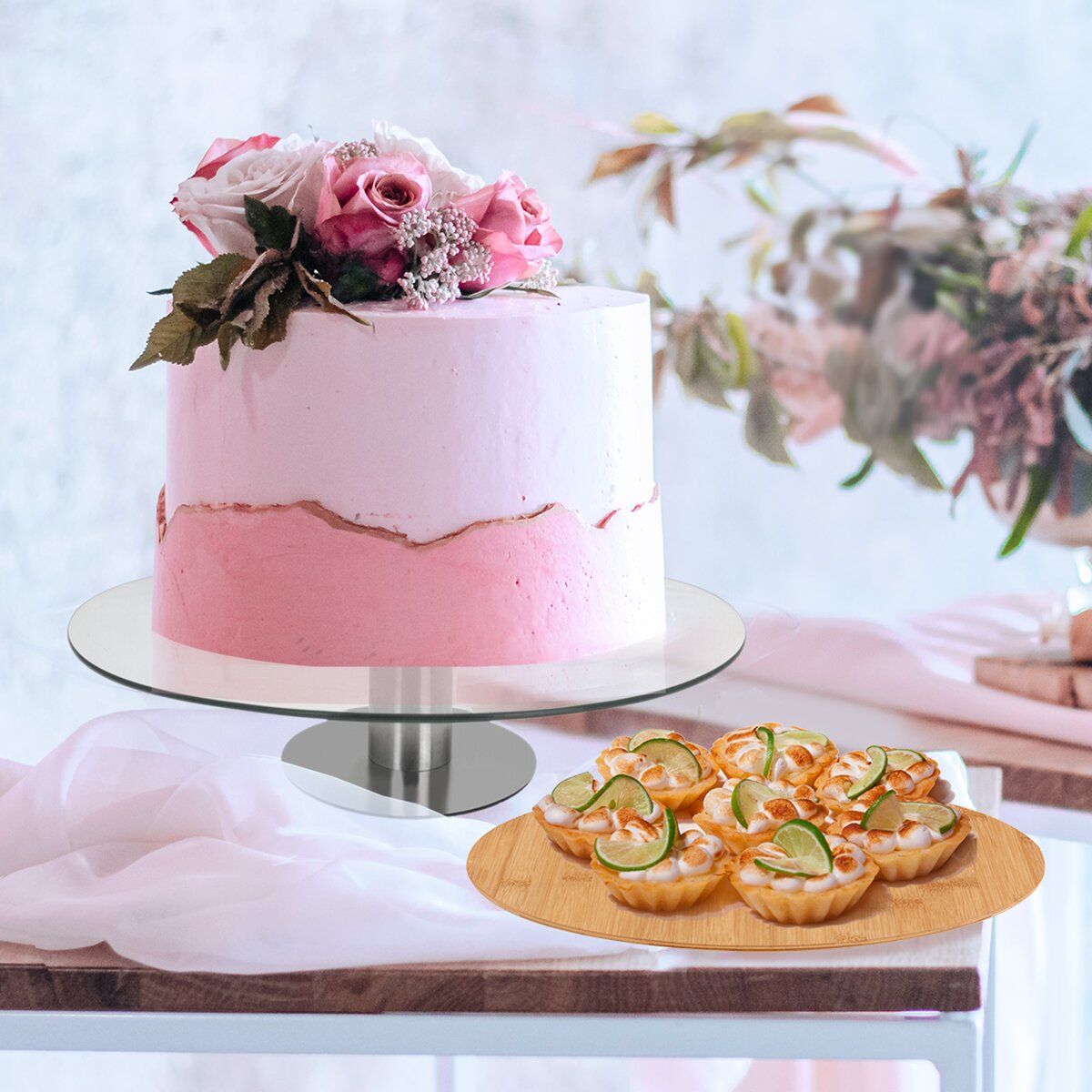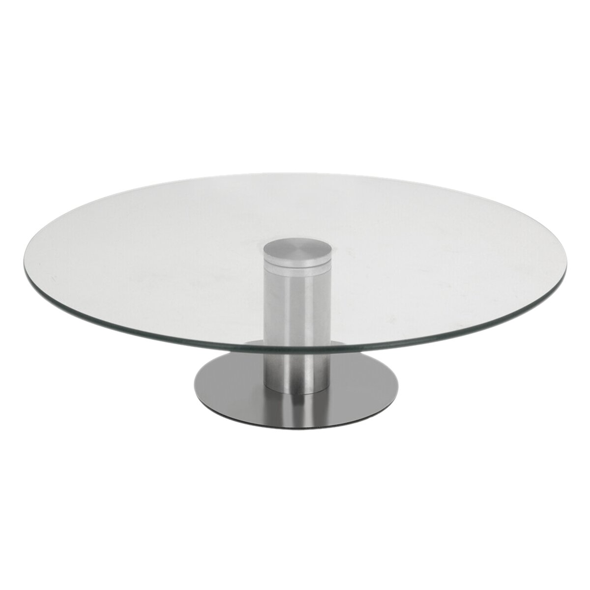 Kód produktu 122978Otočný sklenený stojan s priemerom 30 cm s nerezovým podstavcom pomôže štýlovo servírovať pizzu, zákusky aj chlebíčky, pomôže s ťahaním tort a ich zdobením.