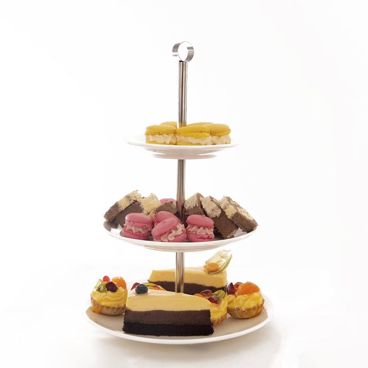 Kód produktu 122964Trojposchodový stojan určený na servírovanie dezertov a slaných pochutín. Súčasťou sú okrúhle porcelánové taniere, ktorých priemer je 15,5 cm, 20,5 cm a 25,5 cm.