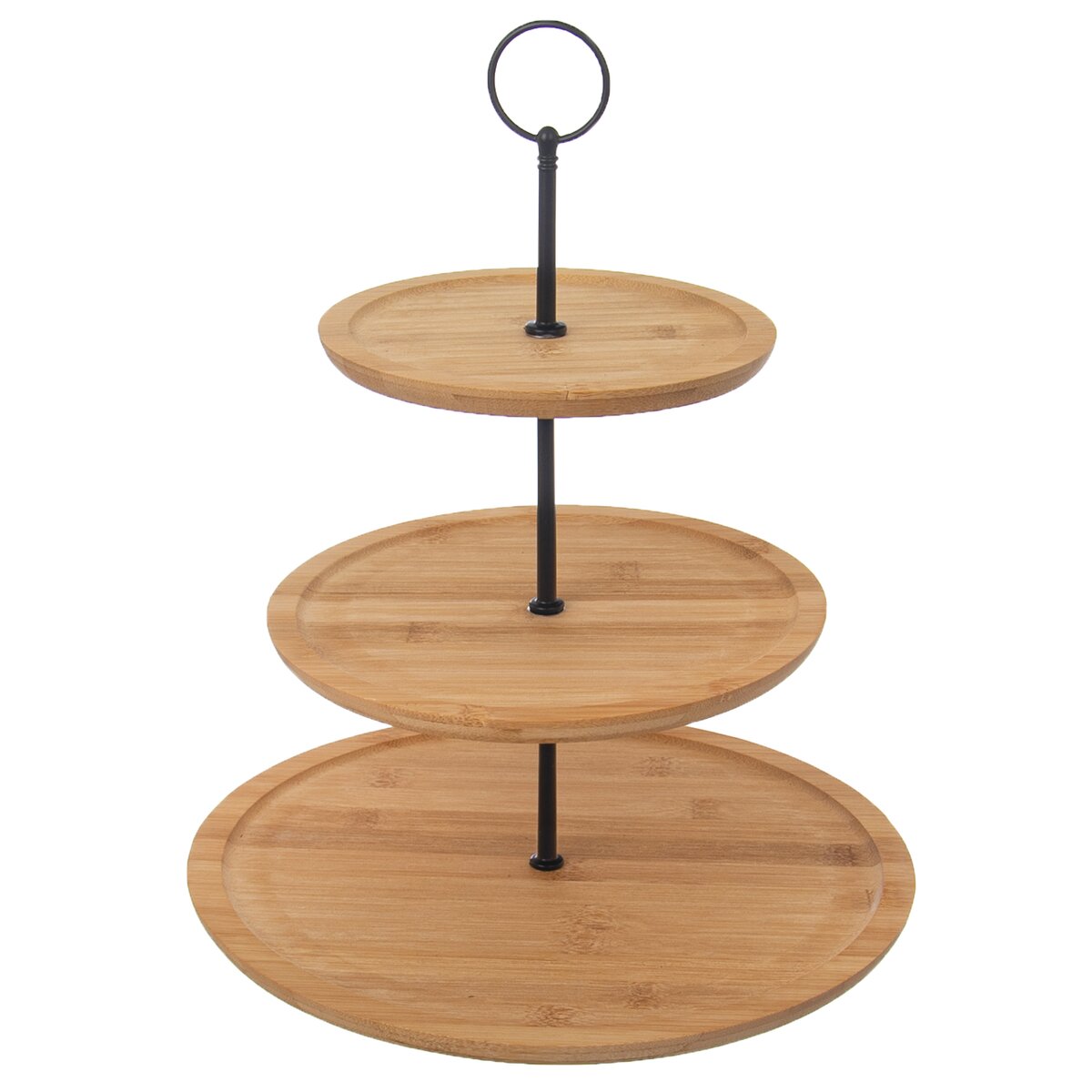 Kód produktu 540594Trojposchodový stojan z kovu a bambusového dreva určený na servírovanie dezertov a slaných pochutín. Okrúhle tácky majú priemer 16,5 cm, 21,5 cm a 28 cm.