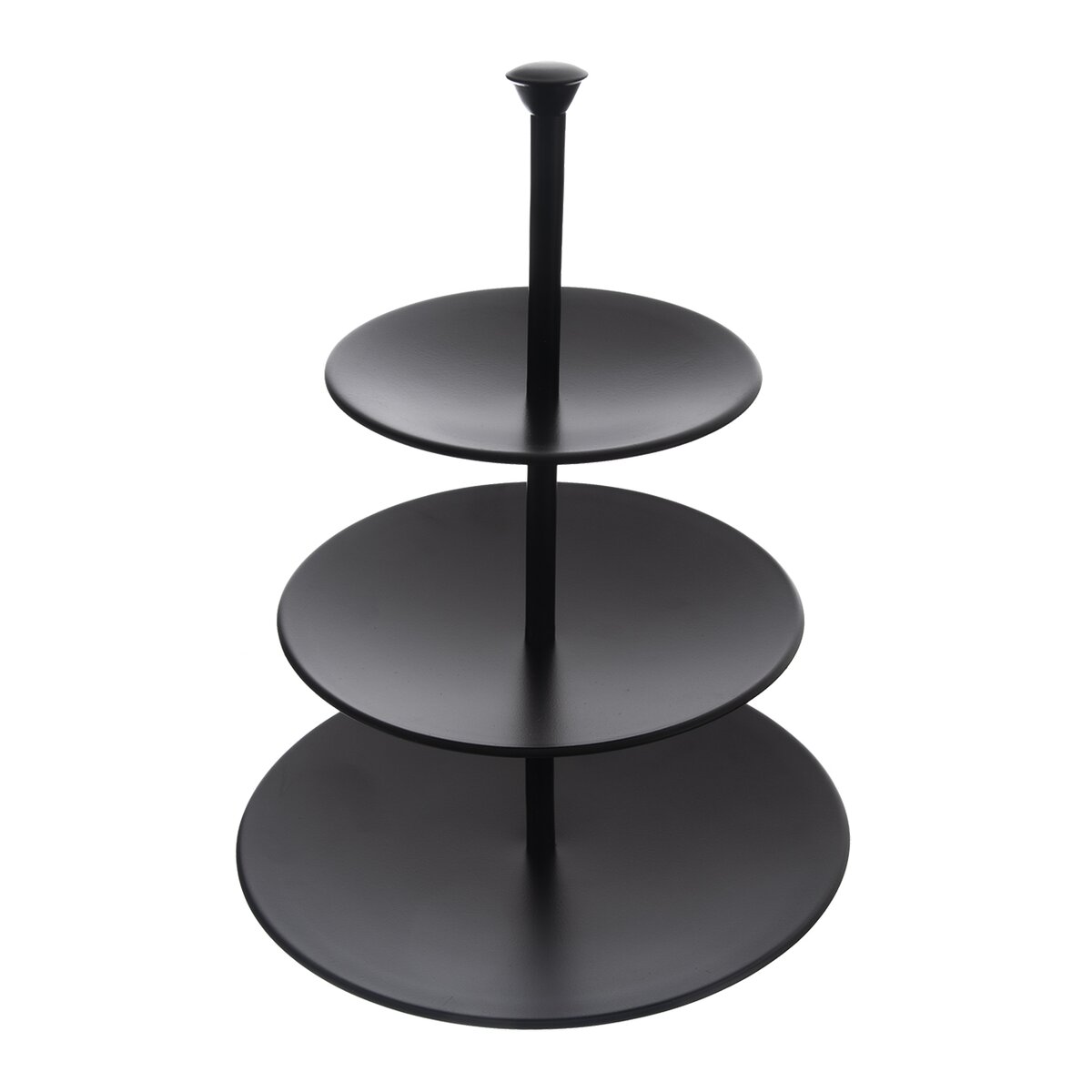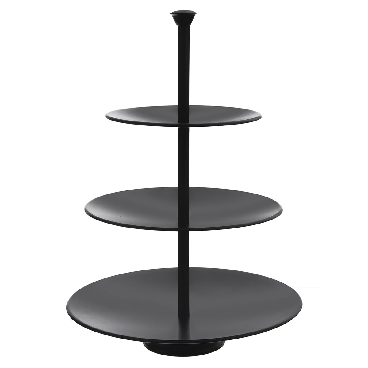 Kód produktu 154301Čierny trojposchodový kovový stojan je určený na servírovanie dezertov a slaných pochutín. Súčasťou sú okrúhle taniere, ktorých priemer je 16 cm, 20,5 cm a 36,5 cm.