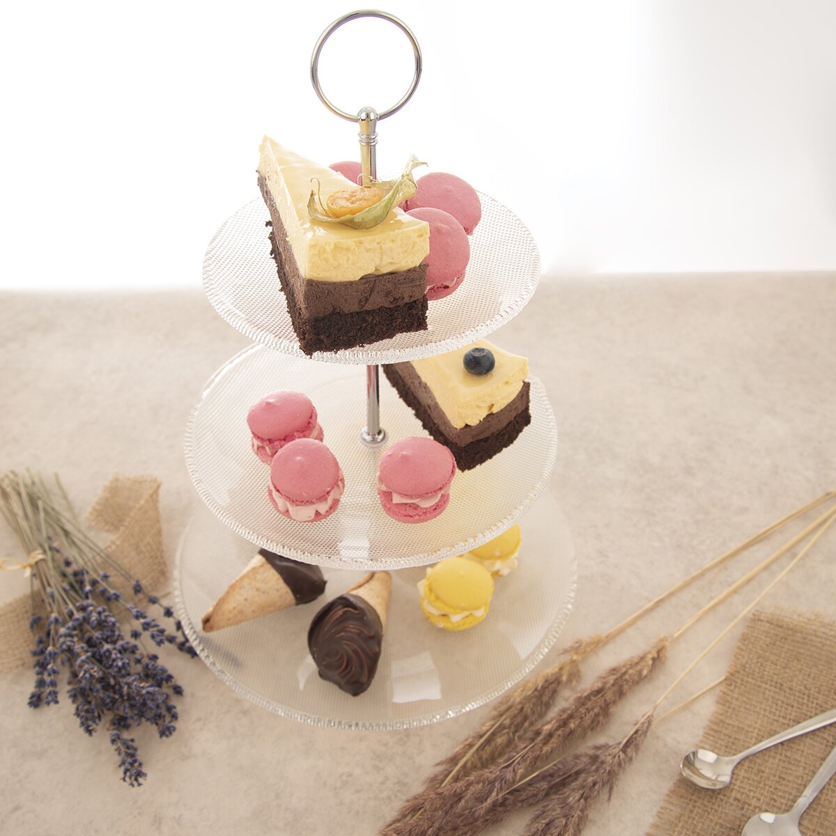Či už organizujete rodinnú oslavu alebo posedenie s priateľmi, umiestnite vybrané dobroty do tohto trojposchodového stojana z kolekcie EMA. Hodí sa na zákusky, koláčiky, pečivo, ovocie i jednohubky. Tvorí ho kovové držadlo s okrúhlym zakončením, ktoré uľahčuje jeho prenášanie.