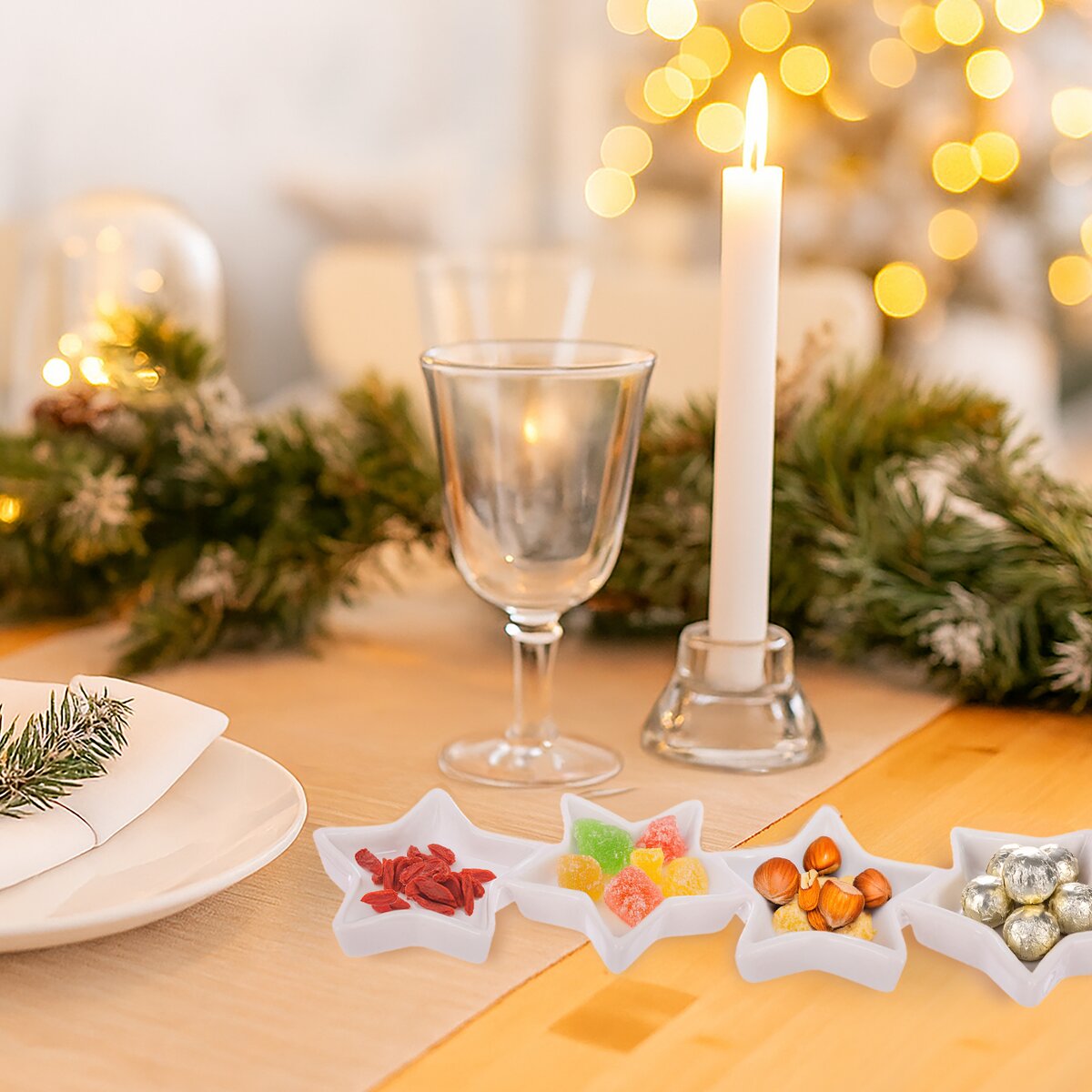 Viac informáciíTácka so spojenými mištičkami v tvare hviezd je štýlovým a praktickým doplnkom na slávnostnom stole. Hodí sa na servírovanie obľúbených orieškov, sušeného ovocia v obľúbenej poleve, kúskov čokolády, kandizovaného ovocia a ďalších pochutín. Napríklad aj kapar, olív, kaviáru alebo dipov.