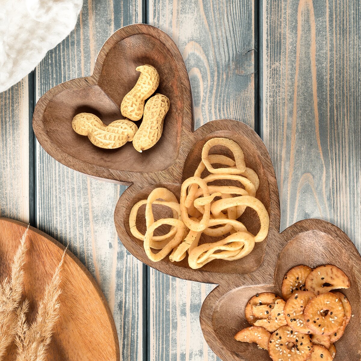 Kód produktu 129223Servírovacia miska z prírodného materiálu je rozdelená do 3 sekcií v tvare srdca. Skvele sa hodí na servírovanie suchých plodov, sušeného ovocia, orechov, cukríkov... Samotná je peknou dekoráciou, možno ju doplniť prírodninami. Materiál: mangové drevo. Rozmery: 40,5x16x3,5 cm. Nemožno umývať v umývačke riadu, nemáčajte, iba utierajte vlhkou handričkou.