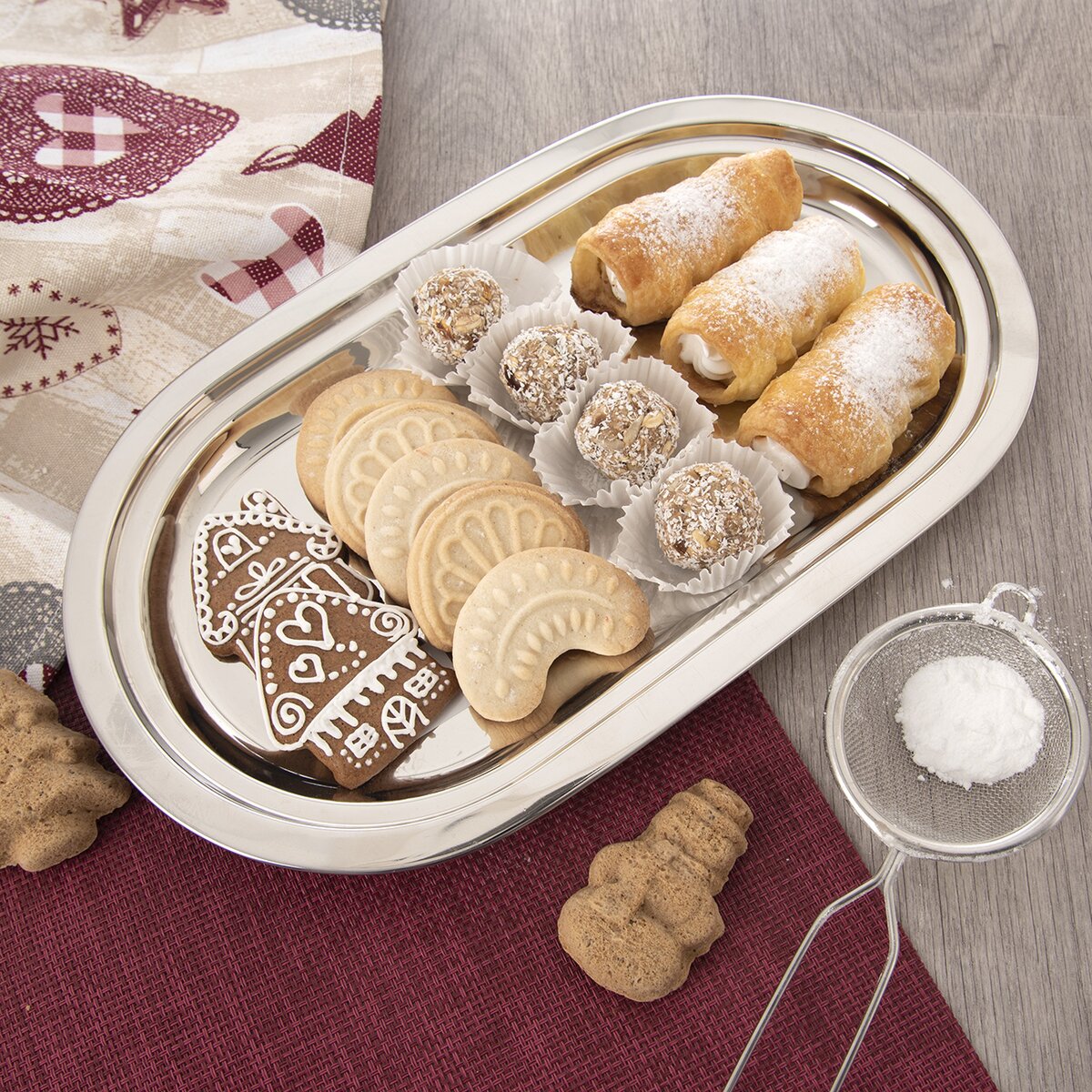 Väčšia oválna tácka, ktorú využijete na grilovačkách, pikniku alebo na najrôznejších oslavách. Je vyrobená z kvalitnej nerezovej ocele. Môžete ju použiť na servírovanie chlebíčkov, jednohubiek, dezertov alebo zákuskov doma, v práci pri občerstvení kolegov alebo zákazníkov aj na rautoch.