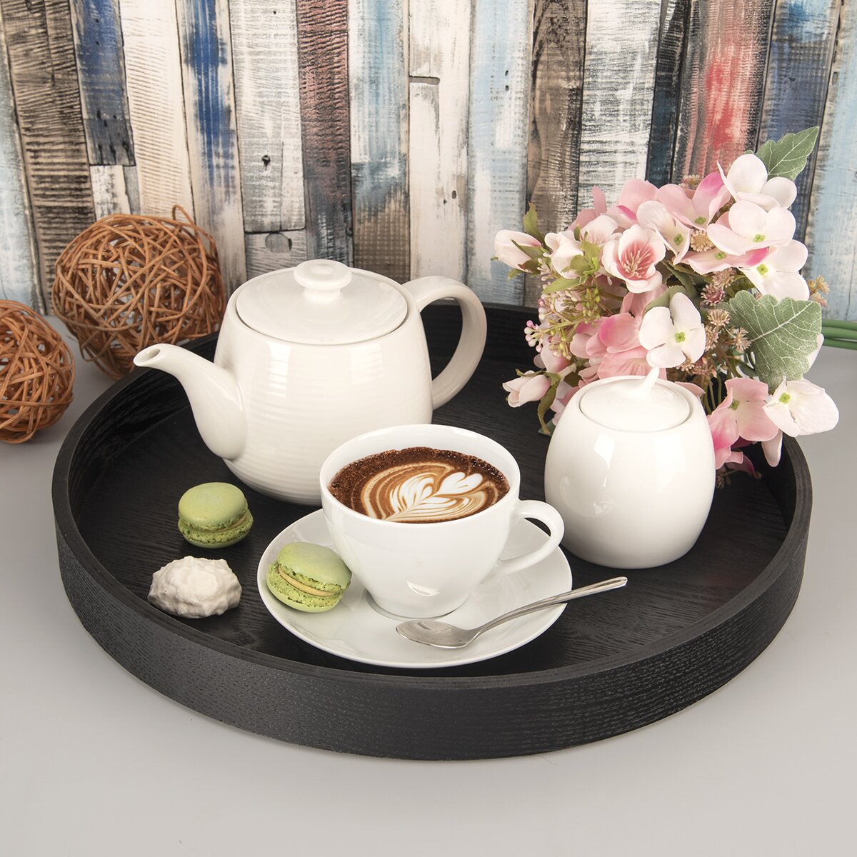 Kód produktu 153872Okrúhla servírovacia tácka čiernej farby, s priemerom 38 cm, je vyrobená z dreva a MDF dosky. Hodí sa na servírovanie kávy, múčnikov, ale poslúži aj ako zaujímavá dekorácia v interiéri.