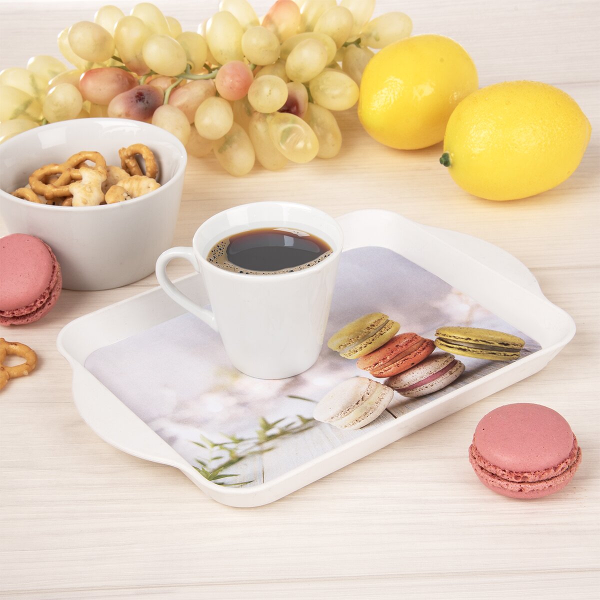 Malú obdĺžnikovú tácku s pekným dekorom makróniek využijete pri servírovaní najrôznejších dobrôt a nápojov, napr. malej kávy i sušienok alebo bábovky na dezertnom tanieriku. Je vyrobená z kvalitného plastu PP, znesie teploty až +40 °C.