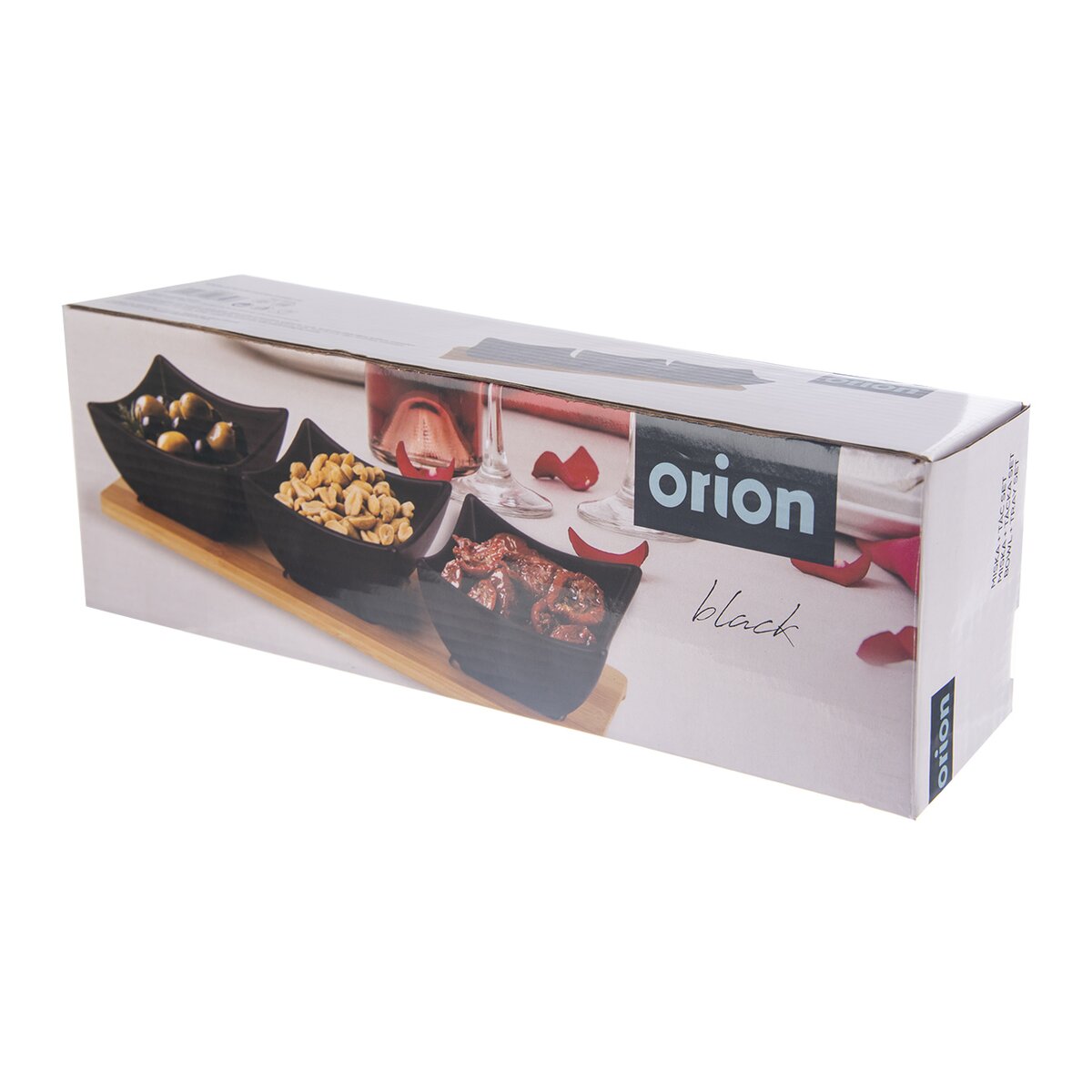 Servírovací set 3 čiernych porcelánových misiek je umiestnený na bambusovej tácke rozmeru 31,5x9x1 cm. Využijete ho na servírovanie pohostenia rodine i hosťom. Hodí sa na podávanie olív, orieškov, zeleniny, krekrov, rôznych údenín, syrov, dipov i sušeného ovocia.