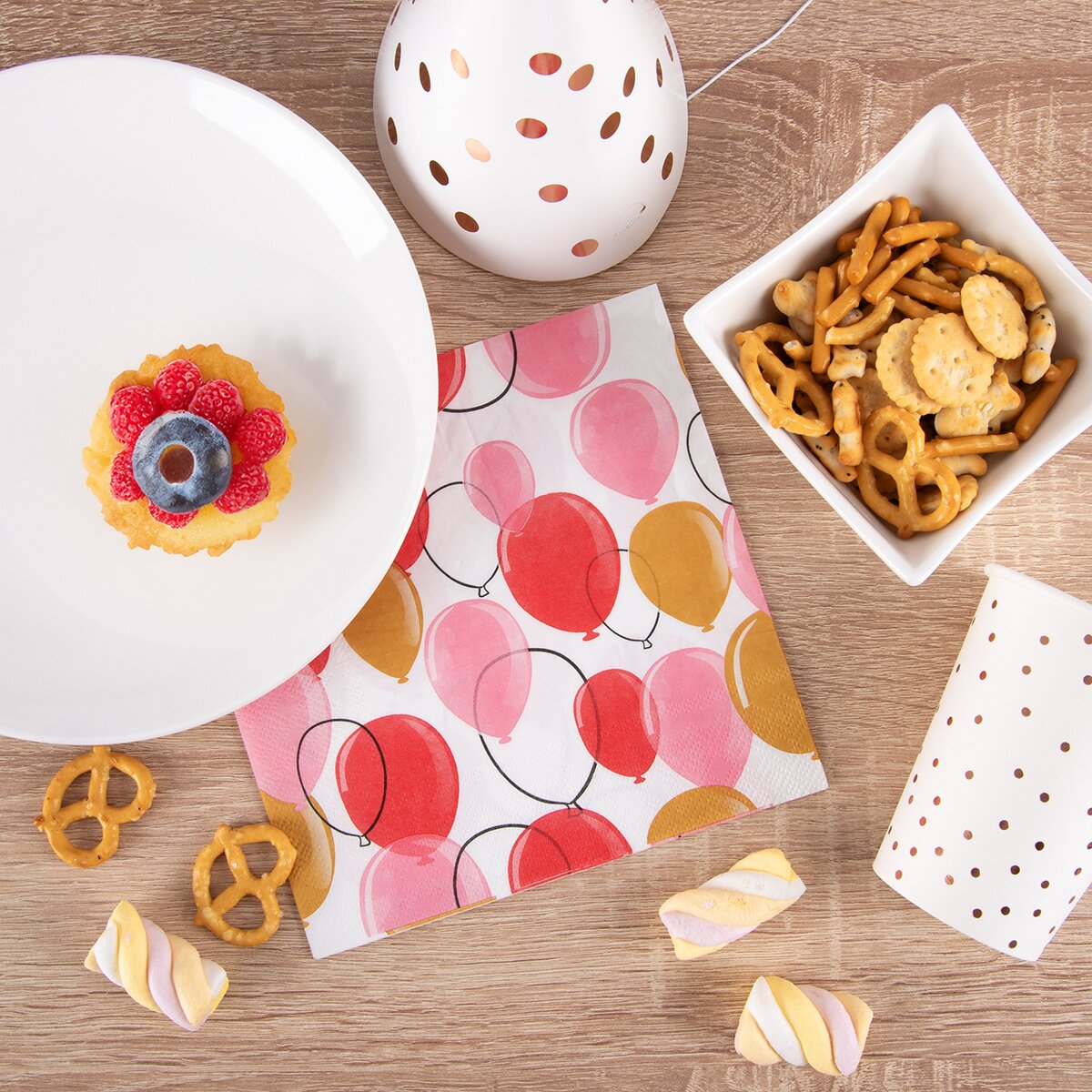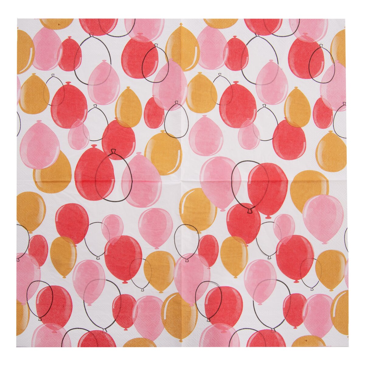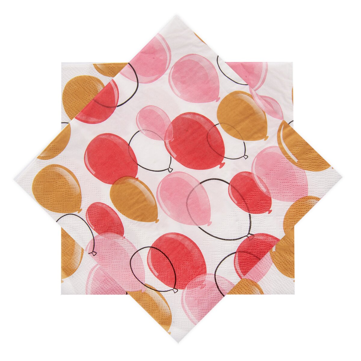 Kód produktu 842332Sada 20 ks svetlých papierových obrúskov s tlačeným motívom ružových, okrových a červených balónikov. Majú veľkosť 33x33 cm a skvele doplnia prestretý stôl doma, na rodinnej alebo firemnej oslave.