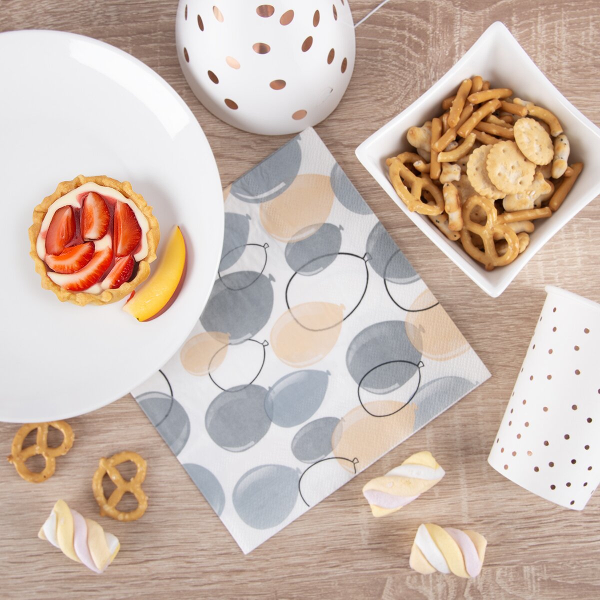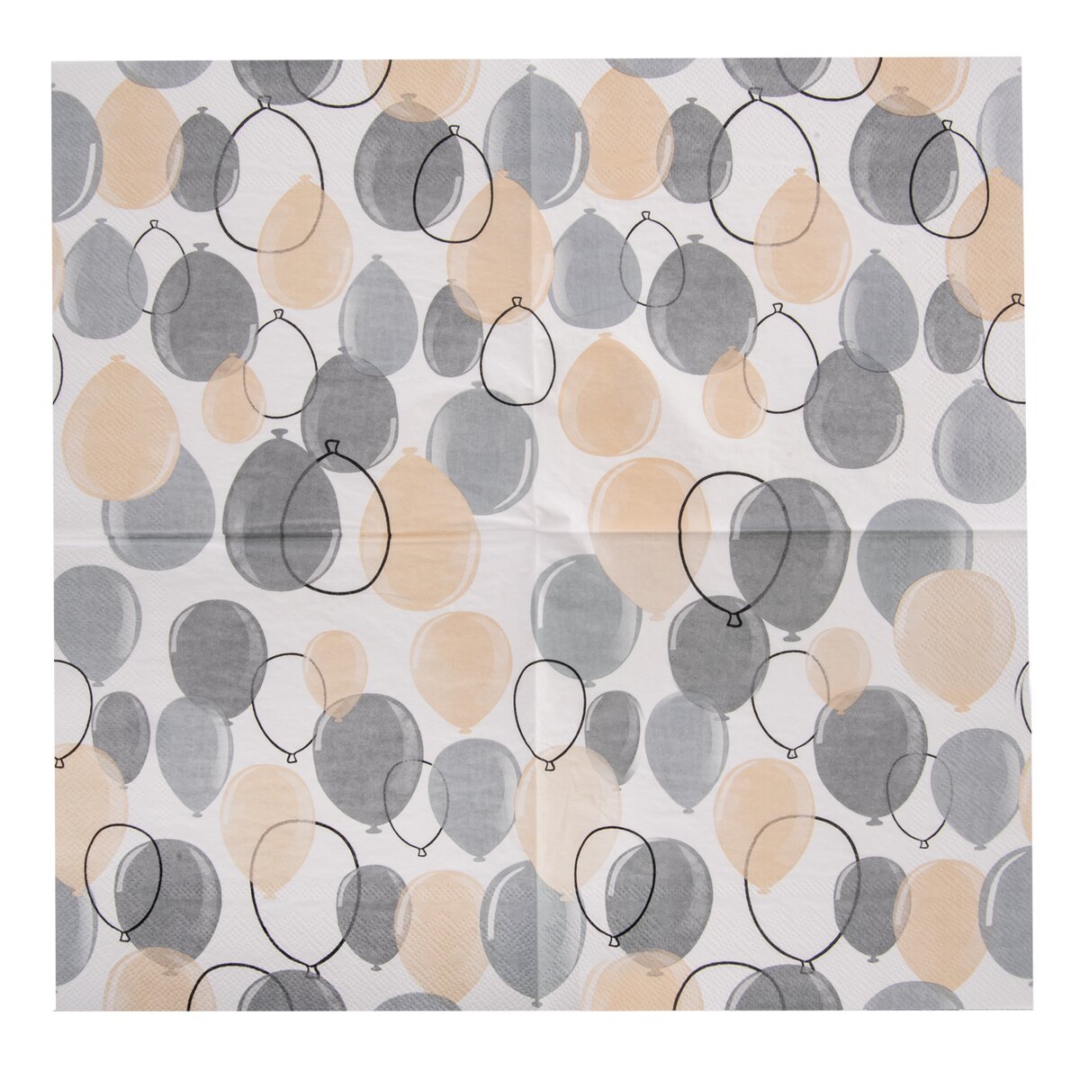 Hurá na párty plnú pekne naservírovaných dobrôt. Na rodinnej aj detskej oslave sú na utretie úst a rúk potrebné obrúsky, ktoré k stolovaniu tiež patria. Tieto zdobia šedobéžový motív nafúknutých balónikov, ktorý sa hodí na záhradnú párty alebo oslavu jubilea.