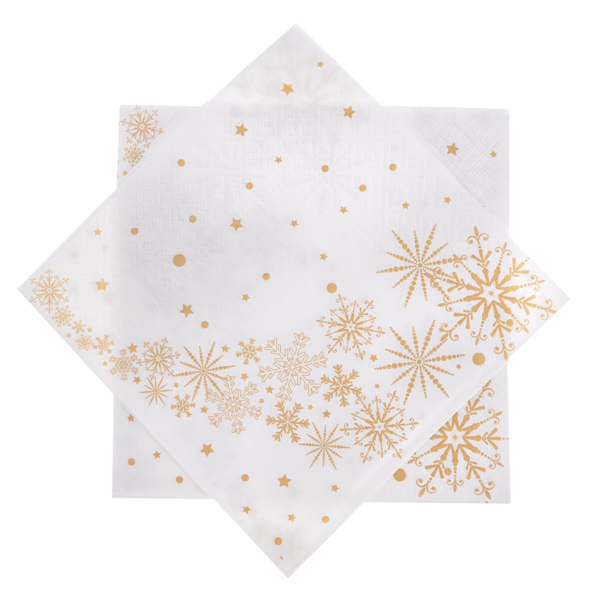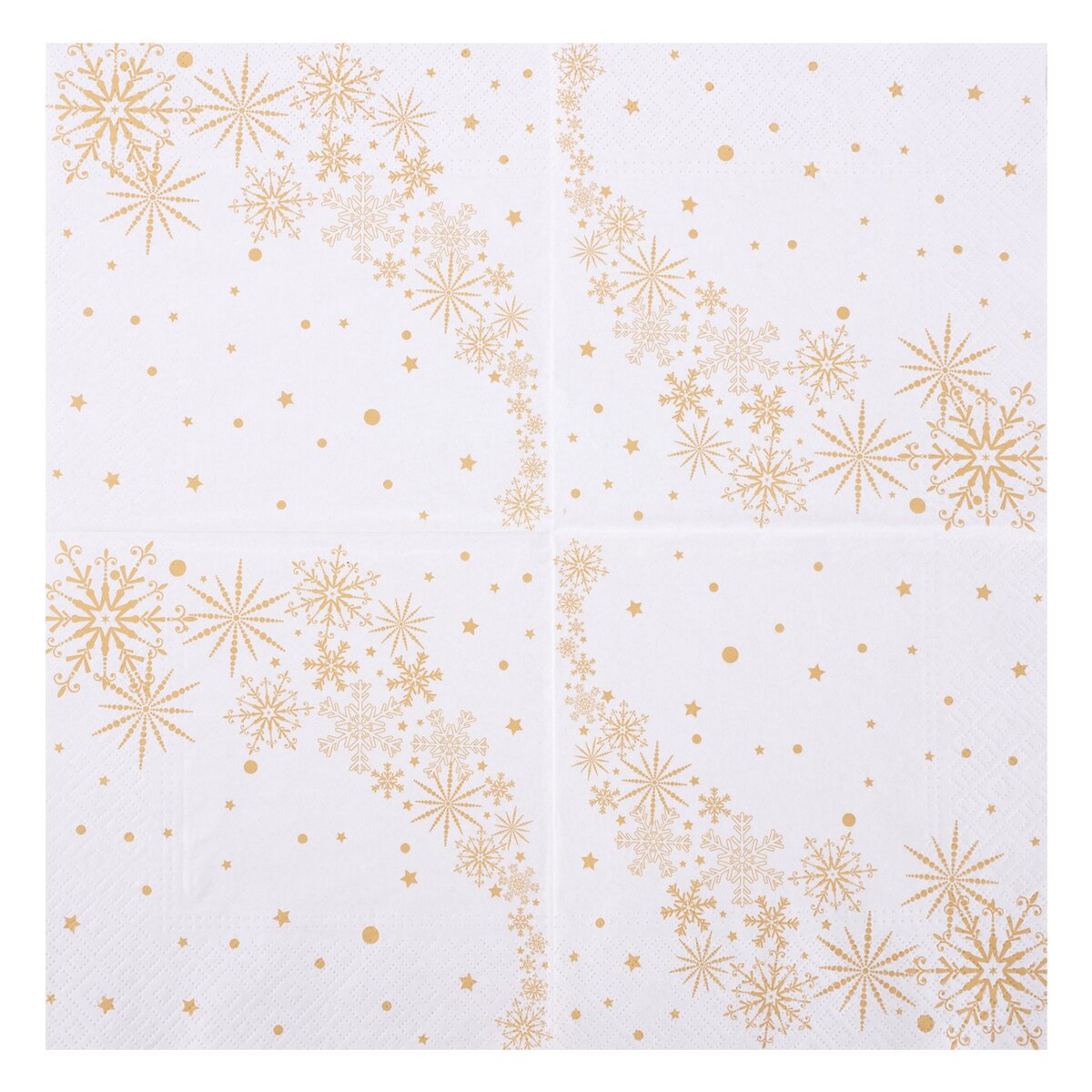 Kód produktu 842369Sada 20 ks svetlých papierových obrúskov je zdobená hviezdičkami a snehovými vločkami v zlatom odtieni. Obrúsky majú veľkosť 33x33 cm a doplnia prestretý stôl počas vianočných sviatkov aj v období Adventu.
