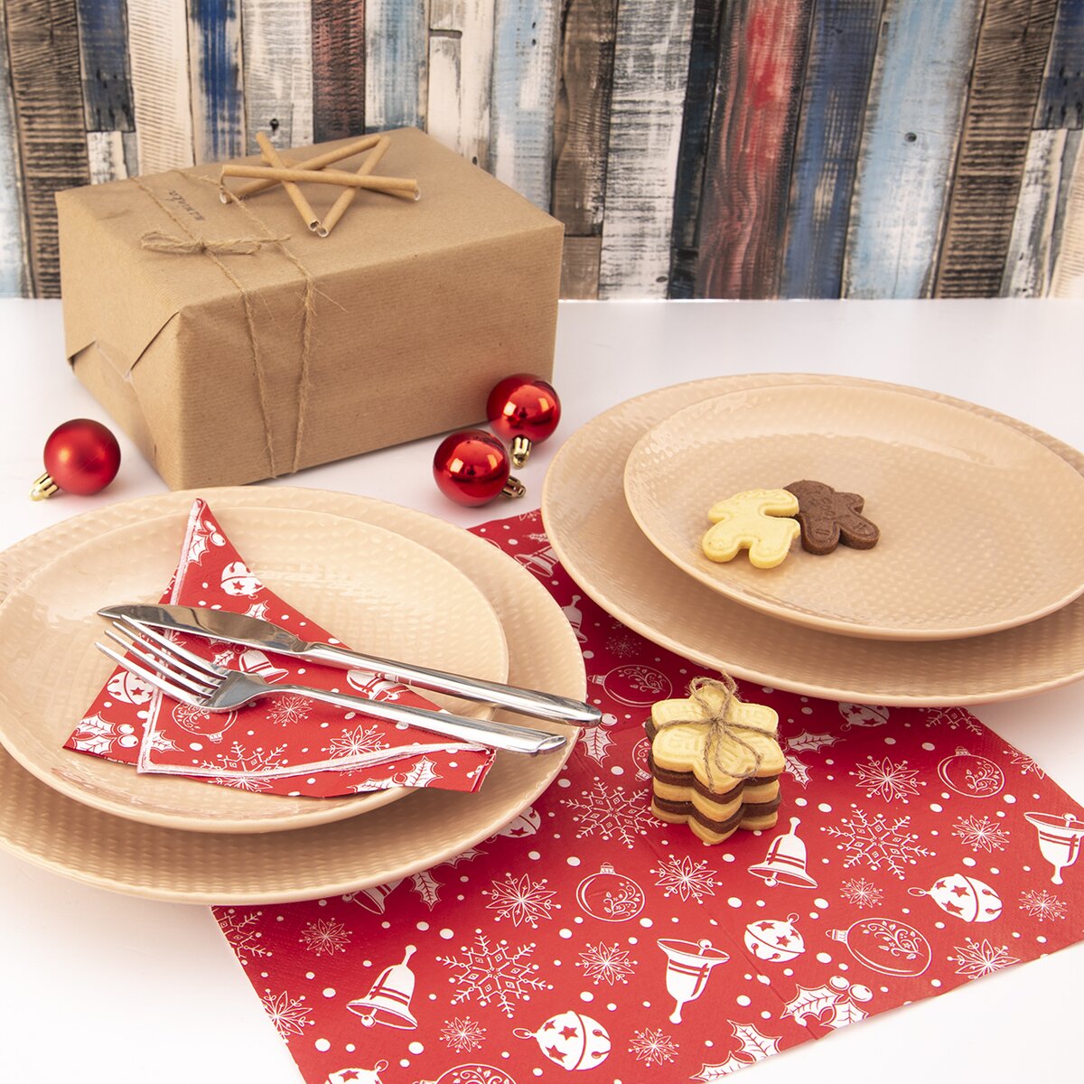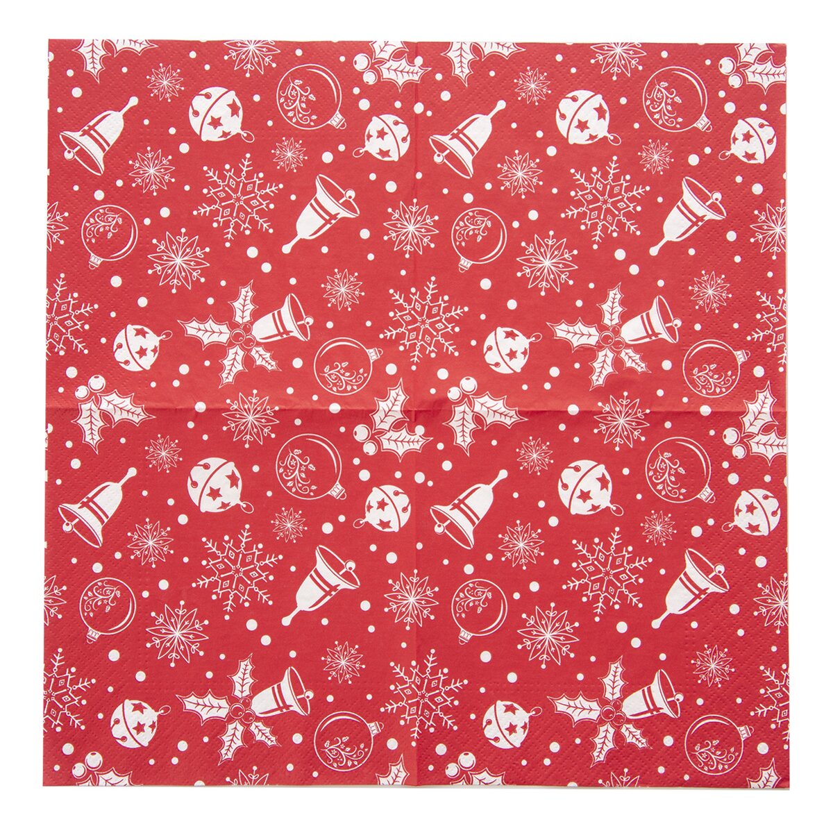 Kód produktu 842307Sada 20 ks červených papierových obrúskov s motívom vločiek a zvončekov, vo veľkosti 33x33 cm, doplní prestretý stôl počas vianočných sviatkov aj v období Adventu.