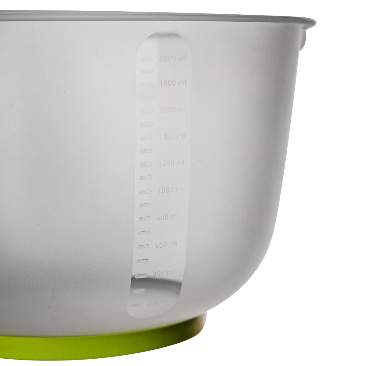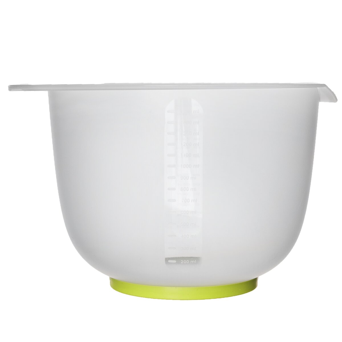 Kód produktu 120282Plastová misa v objeme 2 l s výlevkou, mäkčeným úchytom a protišmykovým dnom pre ľahké šľahanie bielkov, šľahačky, krémov aj cesta. S vyznačenou mernou stupnicou.
