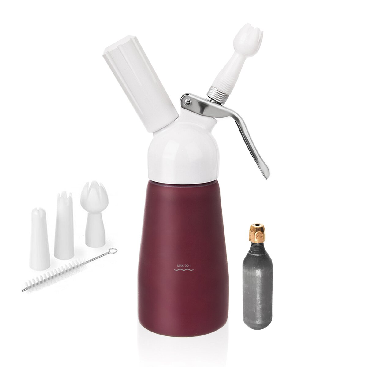 Praktickým pomocníkom, ako si počas chvíle pripraviť kvalitnú šľahačku zo smotany na šľahanie, je odolná hliníková nádoba so silikónovým tesnením, so skrutkovacou hlavou, tryskou a tromi nástavcami a čistiacou kefkou. Vďaka nim je možné vytvoriť nadýchanú šľahačkovú ozdobu na vašich tortách, dezertoch, palacinkách, vafliach, zmrzlinových a ovocných pohároch, ale zjemníte aj omáčky a polievky alebo vytvoríte sladké a slané peny.
