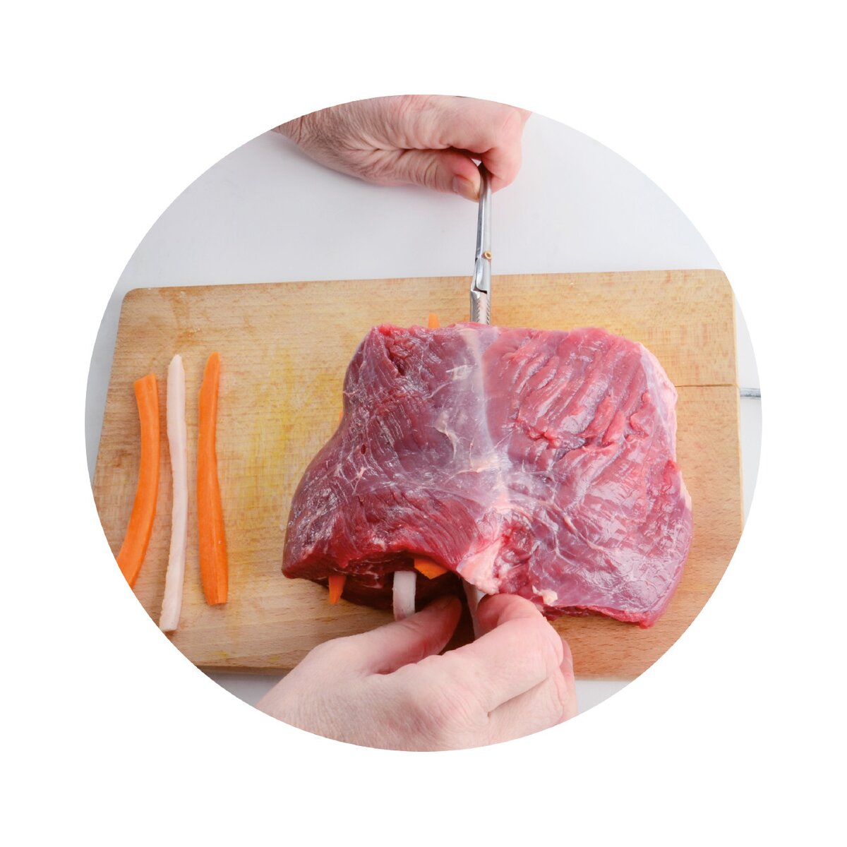Ako na to? Slaninu alebo zeleninu nakrájate na prúžky, upevníte do ihly pomocou háčika a zúbkov, ihlu vďaka ostrej špičke pretiahnete mäsom v smere mäsových vlákien. Nakoniec stačí zo zubatej koncovky slaninu uvoľniť a je hotovo.