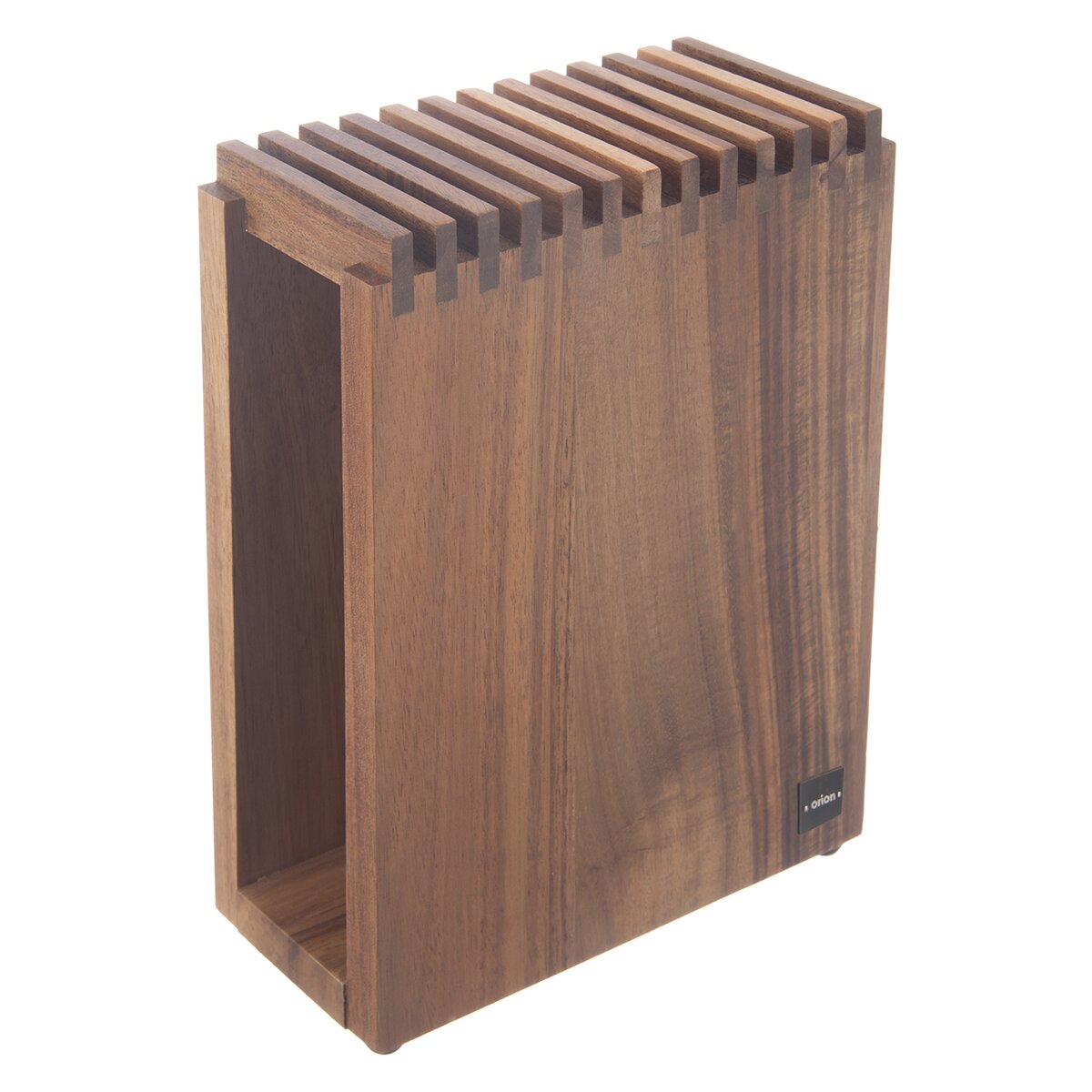 Praktickým riešením na uloženie ostrých kuchynských nožov je stojan na nože. V tomto stabilnom stojane z orechového dreva je možné uložiť nože, či už ide o malé nože na zeleninu alebo veľké santoku nože so širším ostrím. Každý nôž stačí vsunúť do drážky v hornej časti, takže sa nebudú o seba trieť, nedôjde k tupeniu a poškodeniu ostrie.