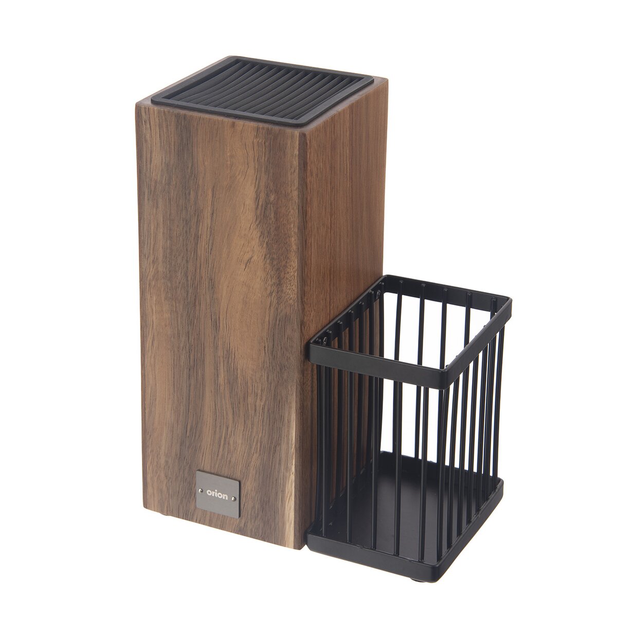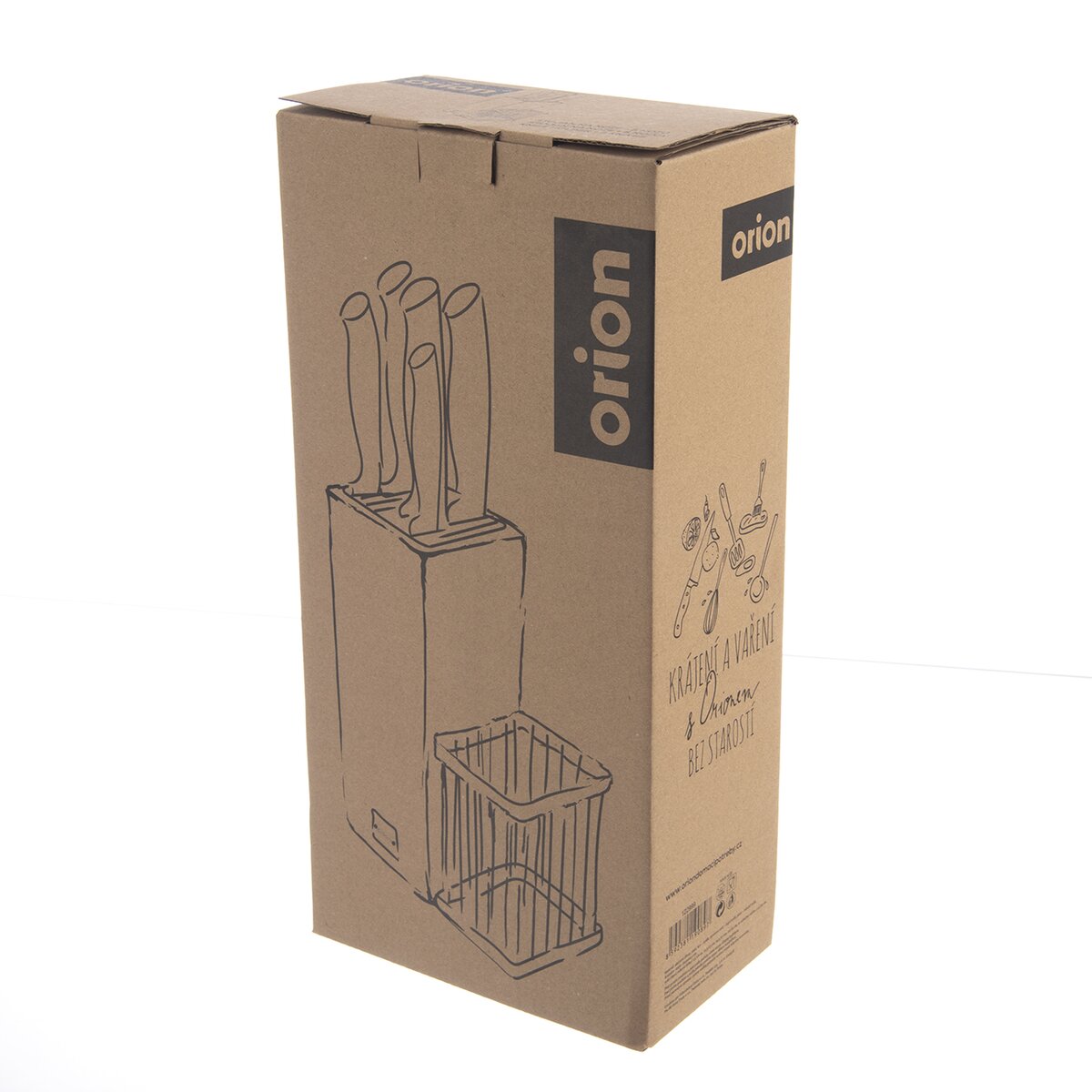 Kód produktu 122999Sada 5 kusov kuchynských nožov s nerezovou čepeľou, uložených v akáciovom stojane s vkladom so štrbinami. Stojan je doplnený kovovým postranným košíkom, vhodným na uloženie rôzneho kuchynského náčinia.