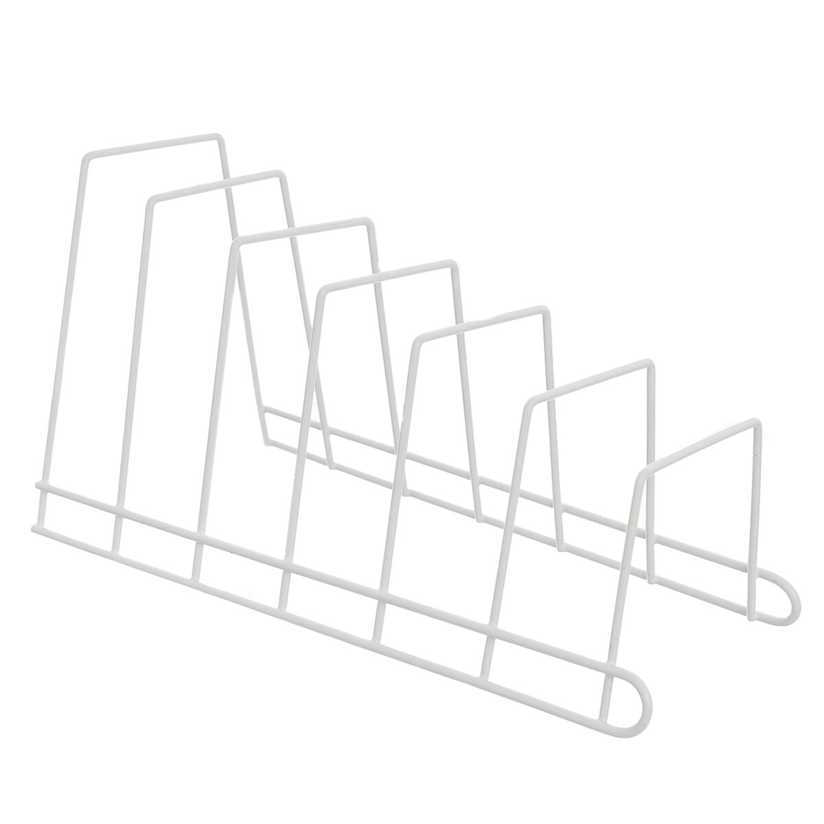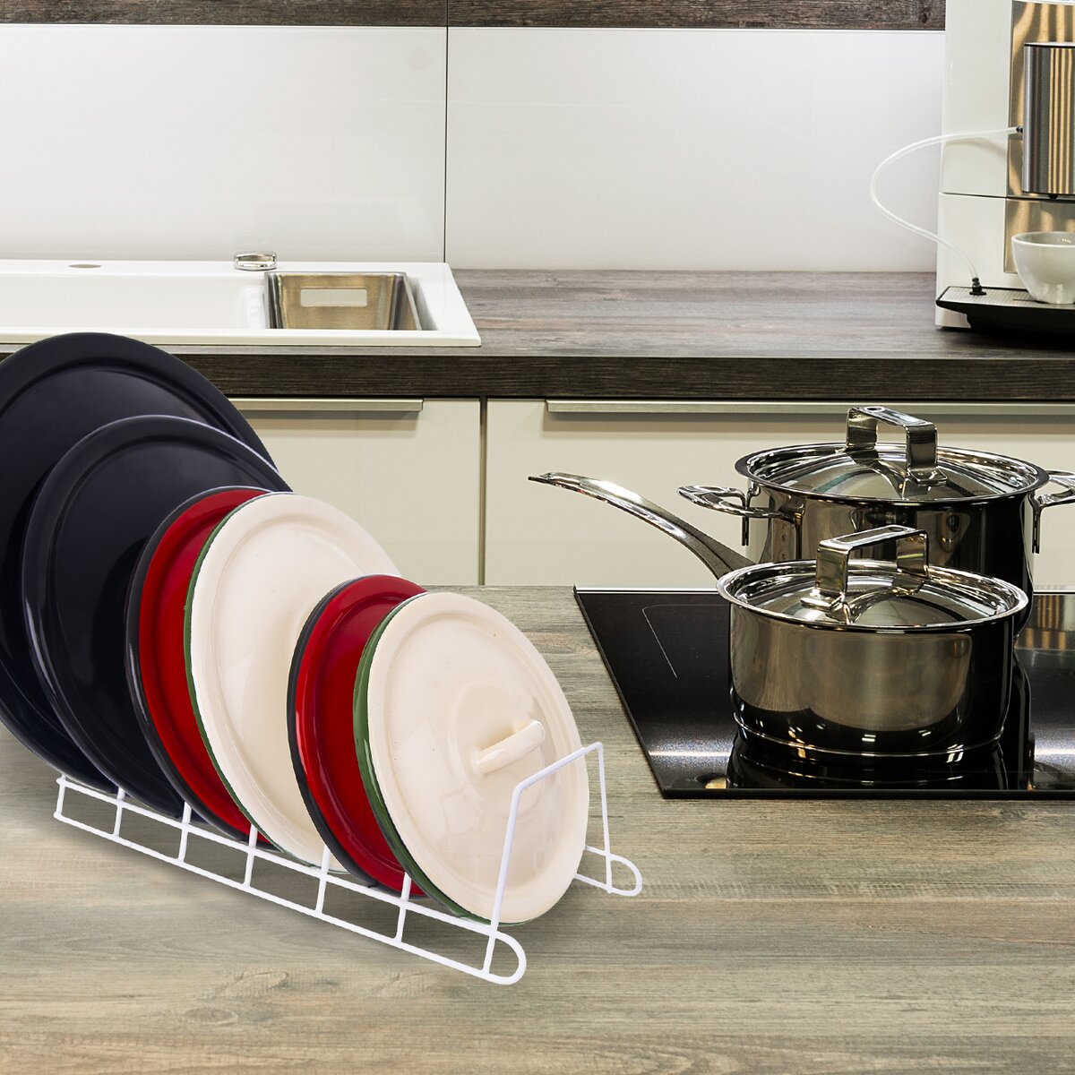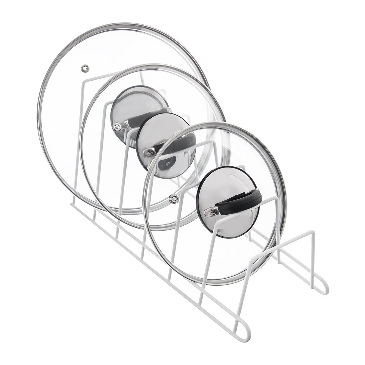 Praktický drôtený stojan s plastovou povrchovou úpravou zaistí bezpečné aj prehľadné uloženie až 6 kusov pokrievok. Či už nerezových, smaltovaných aj sklenených.