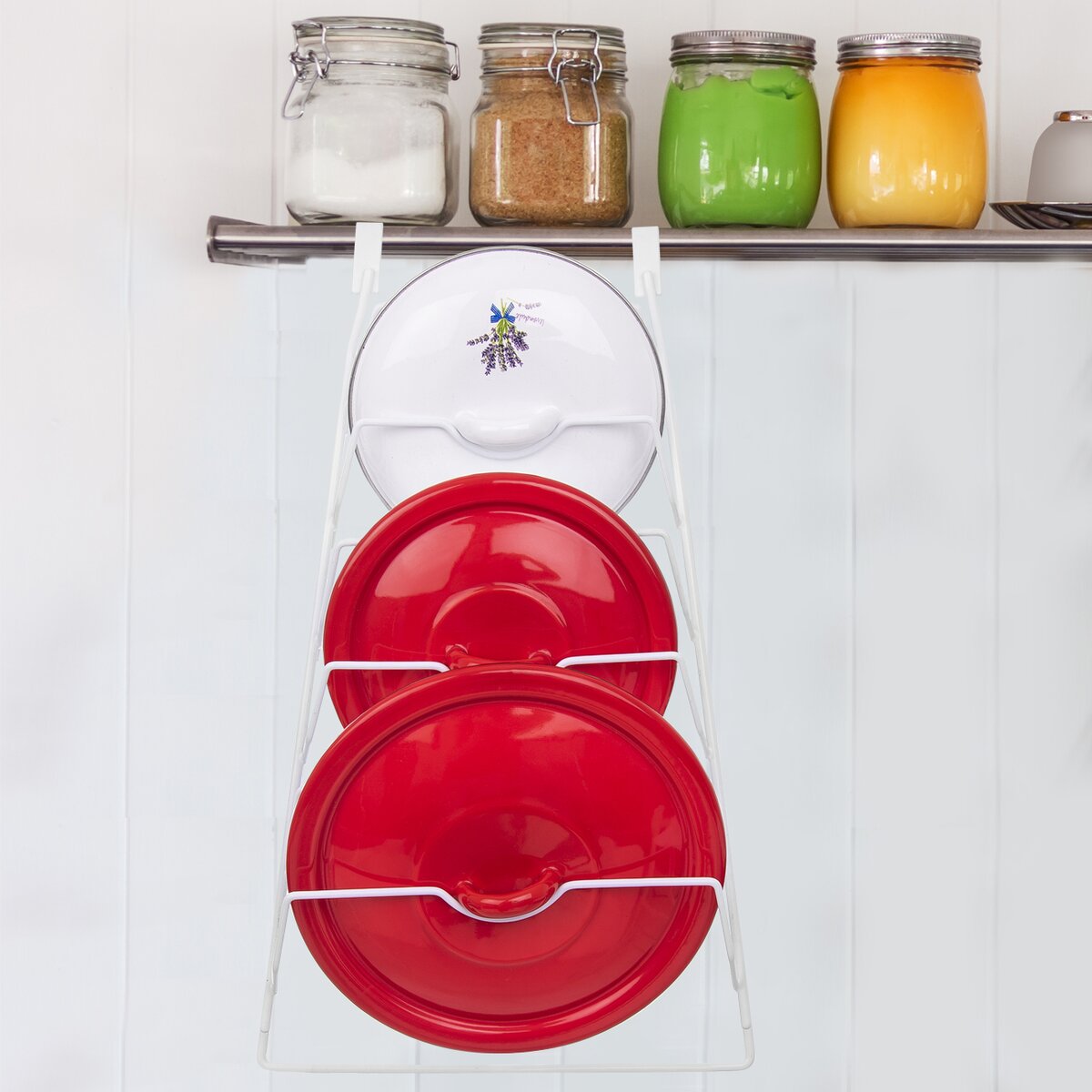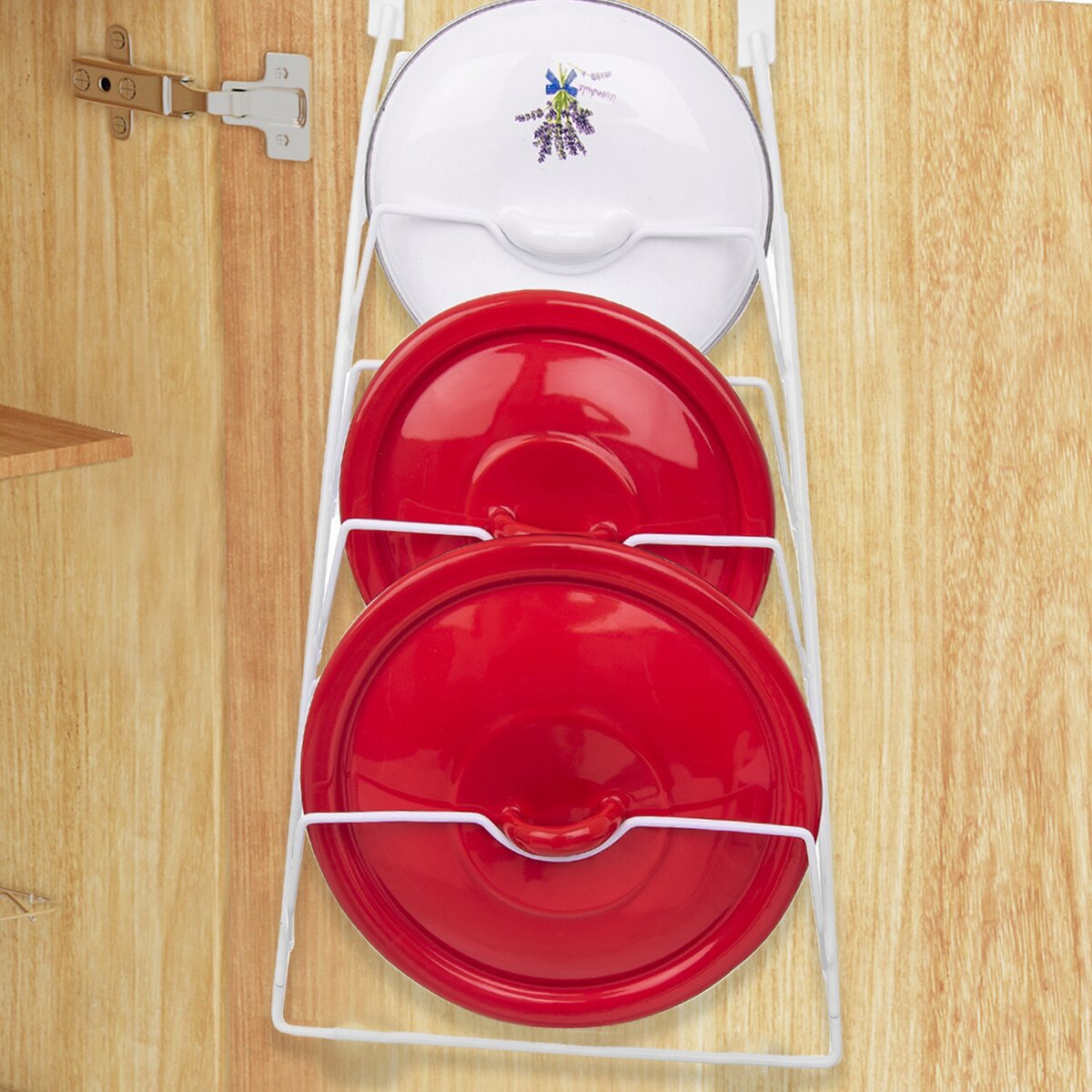 Viac informáciíPraktický drôtený stojan s plastovou povrchovou úpravou zaistí bezpečné aj prehľadné uloženie až 6 kusov pokrievok veľkosti cca 14-28 cm. Či už nerezových, smaltovaných aj sklenených.
