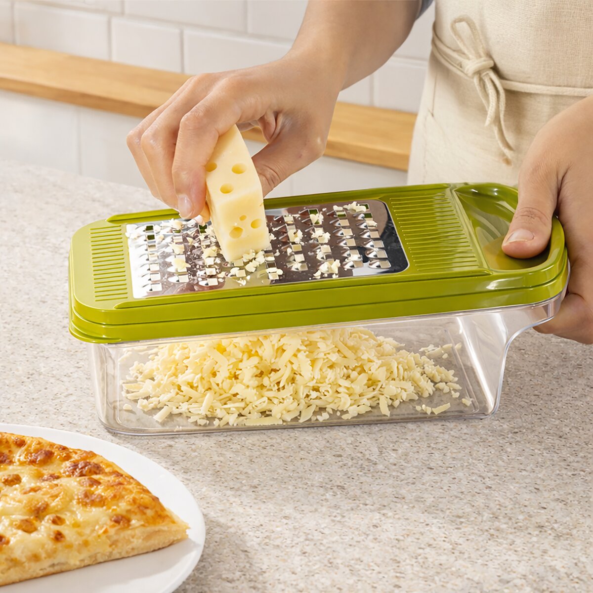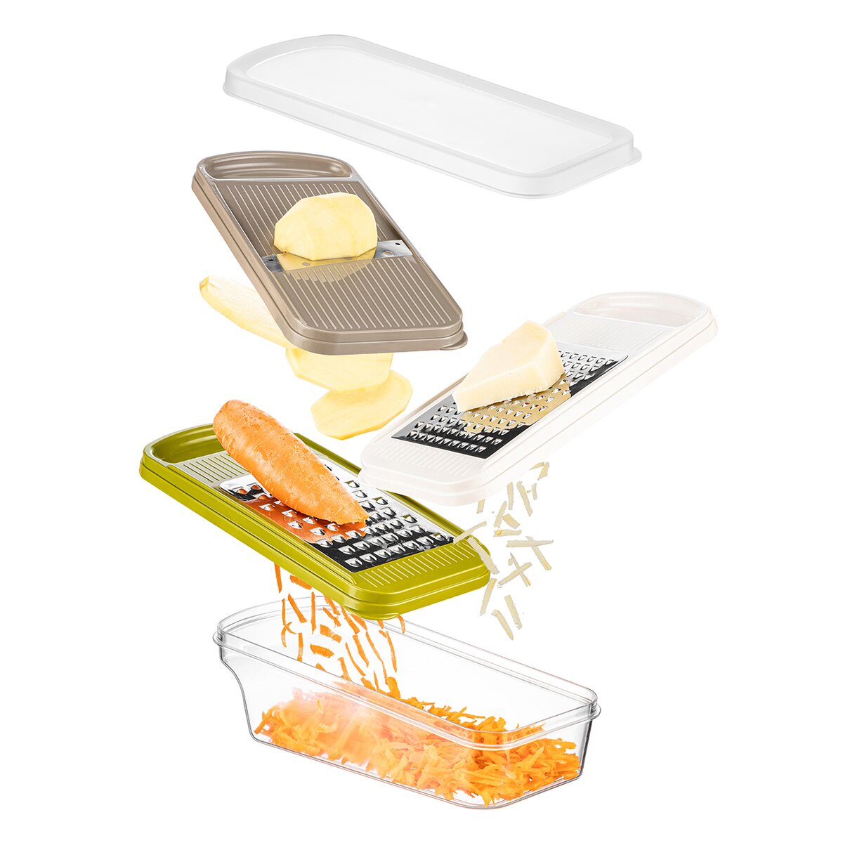 Kód produktu 144813Strúhadlo so zásobníkom je praktickým pomocníkom do každej kuchyne, ktorý uľahčuje prípravu potravín. Disponuje veľkou strúhacou plochou, vďaka ktorej je práca rýchla a efektívna. Súčasťou sú tri vymeniteľné nástavce umožňujúce rôzne druhy strúhania i krájania na plátky, takže ho možno využiť na širokú škálu surovín. Nastrúhané potraviny sa zhromažďujú priamo v zásobníku, ktorý je možné jednoducho uzavrieť vekom a uložiť napríklad do chladničky bez toho, aby bolo nutné obsah presypávať. Ergonomické a ľahké uchytenie zaisťuje pohodlnú a bezpečnú manipuláciu počas krájania, čo oceníte pri každodennom používaní. Výrobok je BPA-free. Materiál: plast PPR (viečko) + plast PS (zásobník) + plast ABS (nástavce) + nerezová oceľ. Rozmery: 24x11x10 cm. Možno umývať v umývačke.