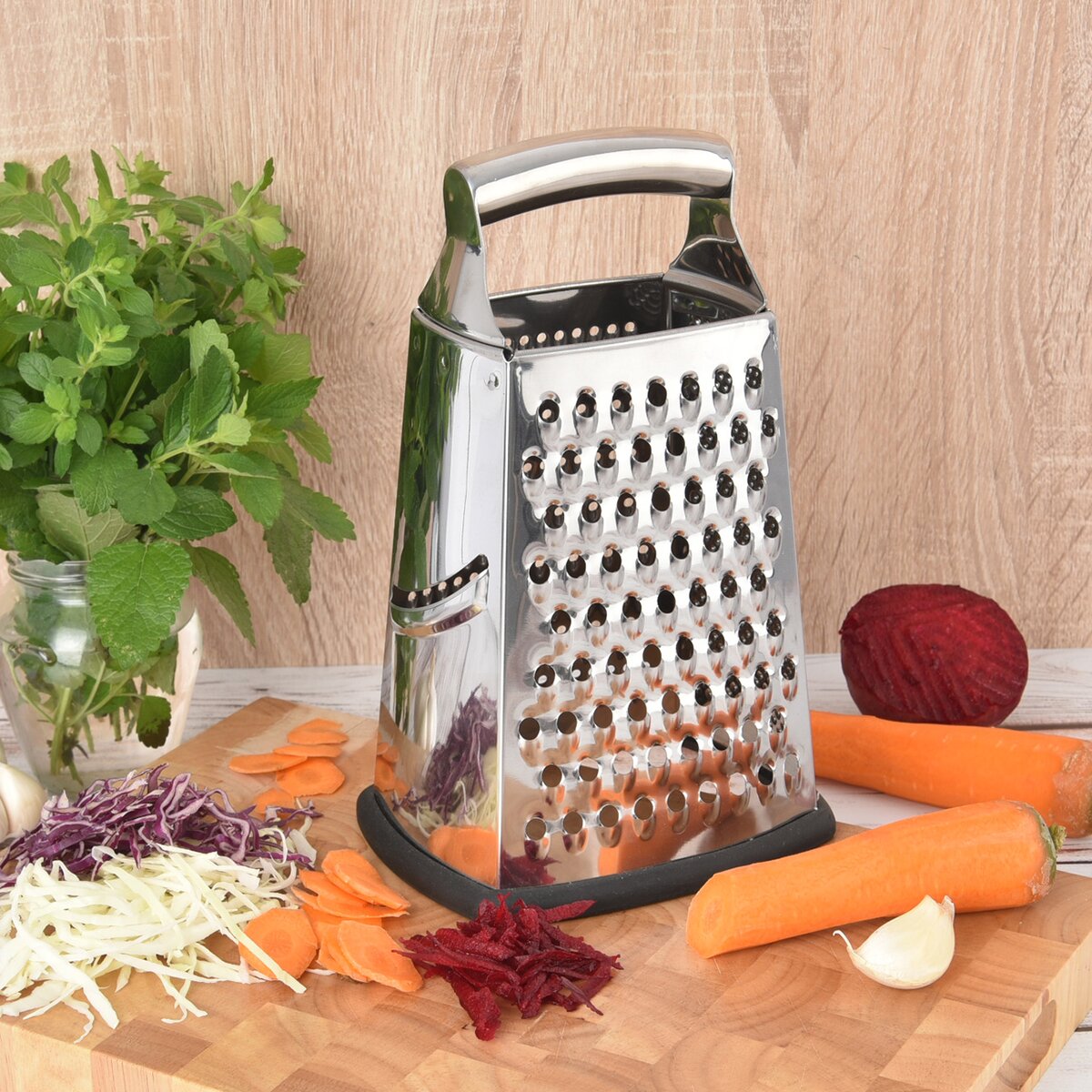 Kód produktu 140779Klasické nerezové štvorhranné strúhadlo s rôznymi typmi plôch, určené na strúhanie ovocia, zeleniny i syrov. Toto strúhadlo sa dá využiť na väčšinu potravín, s ktorými varíte, v dolnej časti je opatrené protišmykovou silikónovou plochou.