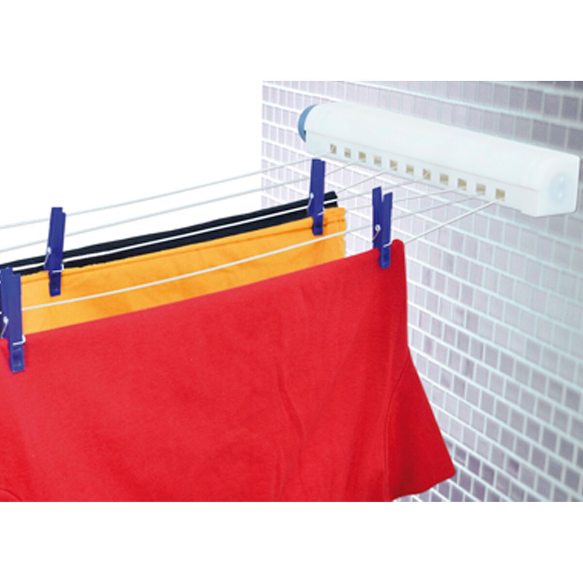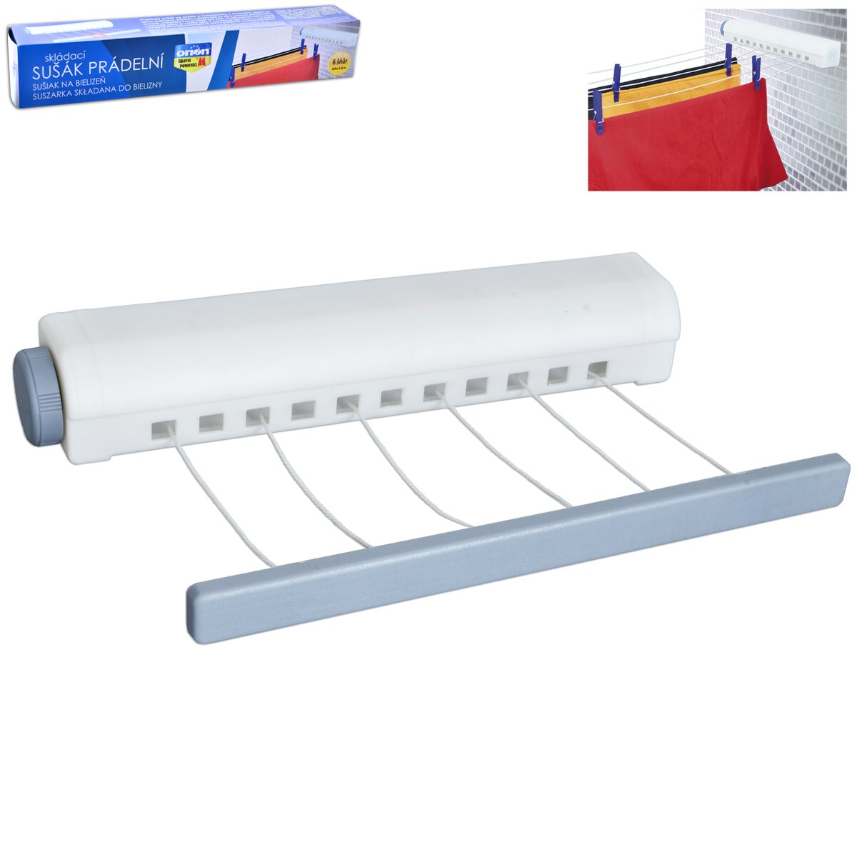 Sušiak na bielizeň zvinovací so 6ti šnúrami využijete v kúpeľni, na balkóne, na terase,... Pripevníte na stenu sušiak a na protiľahlú stenu úchytky a podľa potreby šnúry buď vytiahnete alebo ich vrátite späť a nezaberajú Vám miesto. Materiál: plast. Rozmery: 37x6x6,5 cm, max. dĺžka šnúr 3,66 m. Max. zaťaženie 3 kg.
