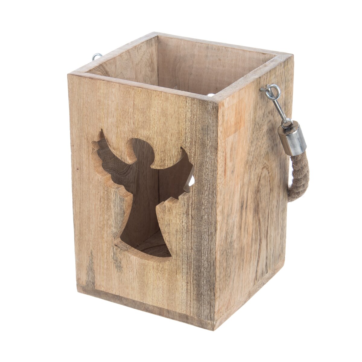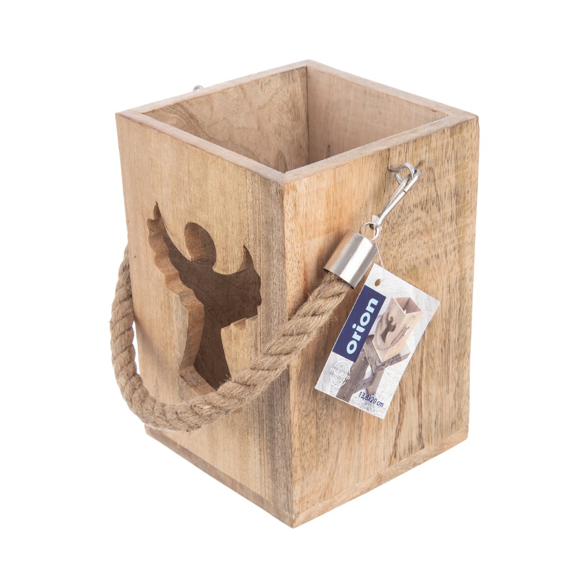 Viac informáciíKrásny svietnik z mangového dreva je doplnený silným jutovým povrazom vhodným na zavesenie. Do vnútri je možné umiestniť sviečku alebo led osvetlenie, svetlo z neho preniká vyfrézovaným otvorom v tvare anjela. Tento okúzľujúci lampáš bude krásnym prvkom v interiéri, ale urobí veľkú parádu aj na terase, kde umocní oddych s pohárom vína alebo šálkou kávy v podvečerných hodinách.