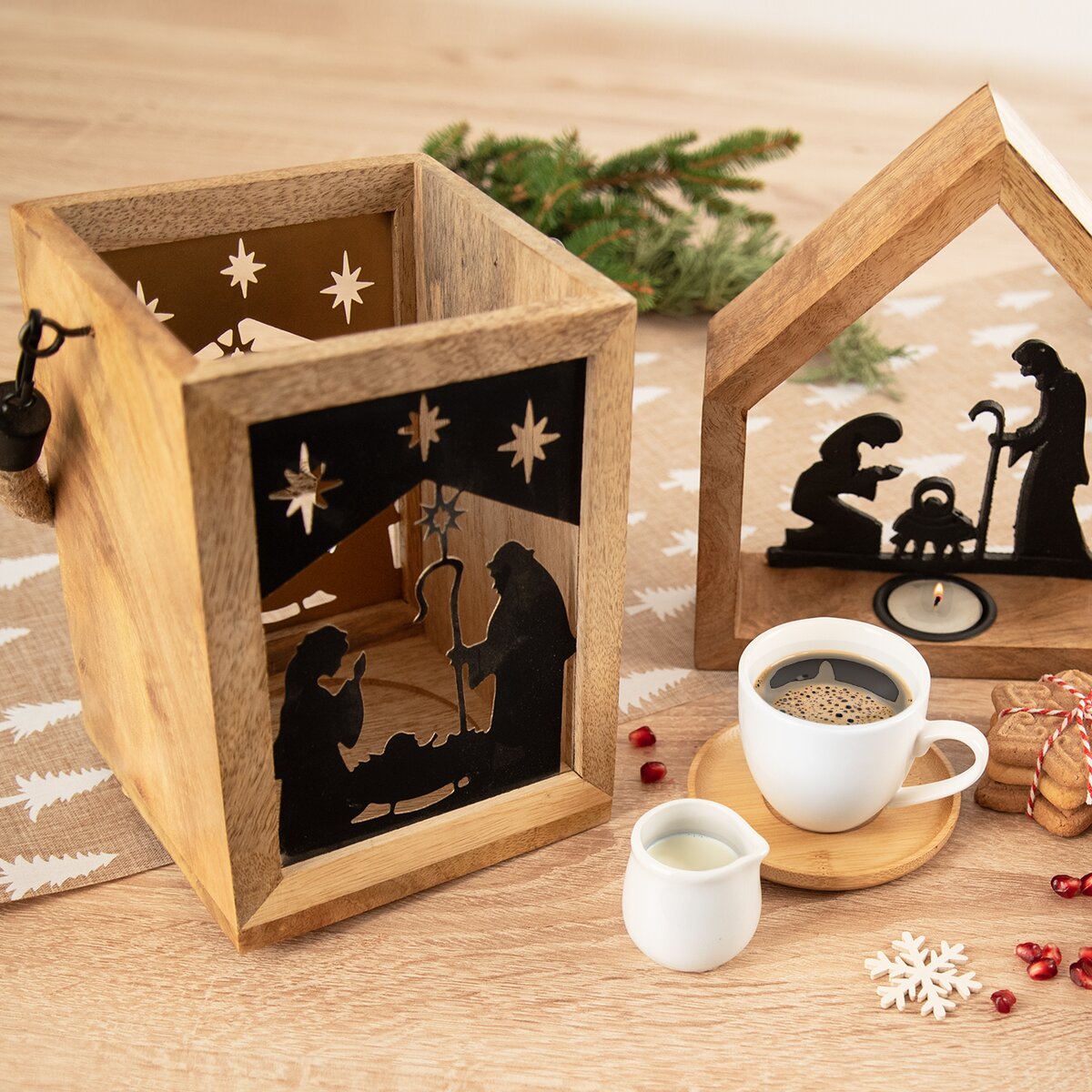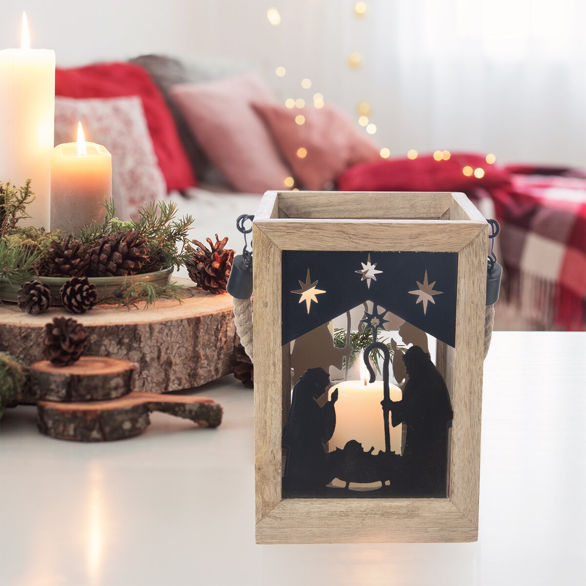 Kód produktu 351839Hranatý svietnik s krásnou textúrou mangového dreva a čiernou kovovou siluetou z Betlehema je vhodný ako darček alebo z neho bude štýlový kúsok do interiéru. Je možné ho zavesiť za jutové držadlo.