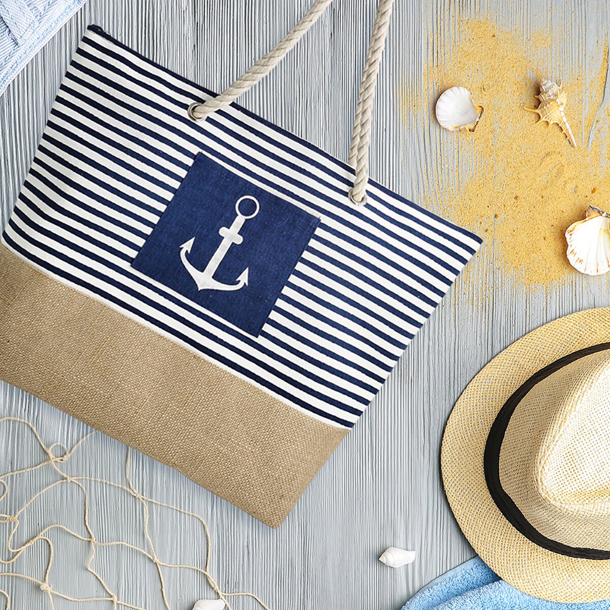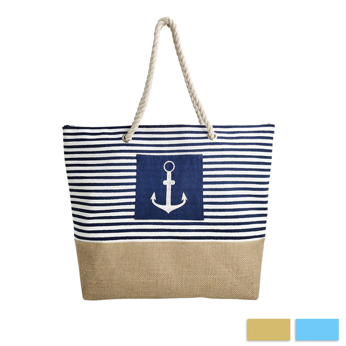 Kód produktu 731415Plážová taška z juty, bavlny a polyesteru v námorníckom štýle, s dvoma ušami a vnútorným a vonkajším vreckom, ktorá sa hodí nielen k vode, ale aj na nákup v obchode alebo na trhu.