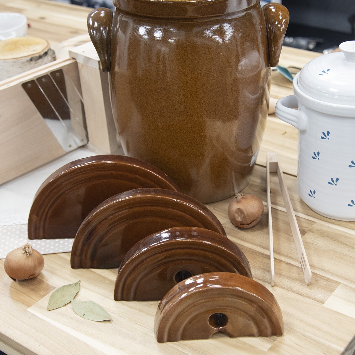 Viac informáciíPokiaľ doma vlastníte keramickú nádobu na nakladanie potravín, napr. nakladací hrniec 8 l, hrniec 10 l, hrniec 12 l alebo hrniec 16 l, príde vám vhod toto keramické ťažítko s priemerom 18 cm. Slúži na zaťaženie zeleniny, z ktorej tak ľahšie vyteká šťava a zároveň k nej nejde vzduch. Je rozdelené na dve časti, čo ho umožňuje vložiť aj do nádob, ktorých priemer hrdla je menší ako uvedený skompletizovaný priemer. Otvory v ťažítku uľahčujú jeho vyberanie. Oproti drevu navyše zabraňuje vzniku plesní a baktérií.
