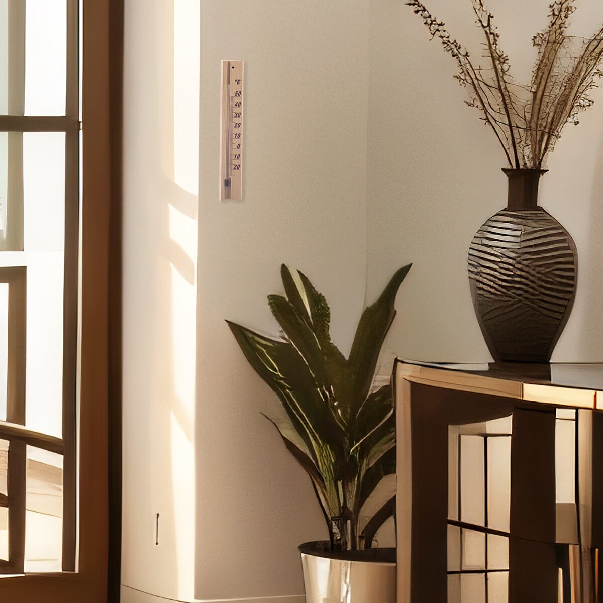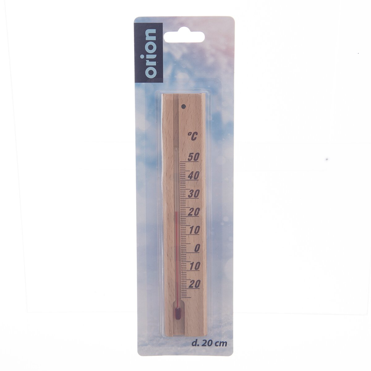 Tento nástenný drevený teplomer sa hodí na meranie teploty ako vo vnútorných, tak aj krytých vonkajších priestoroch. Má otvor na zavesenie a obsahuje petrolejovú náplň.