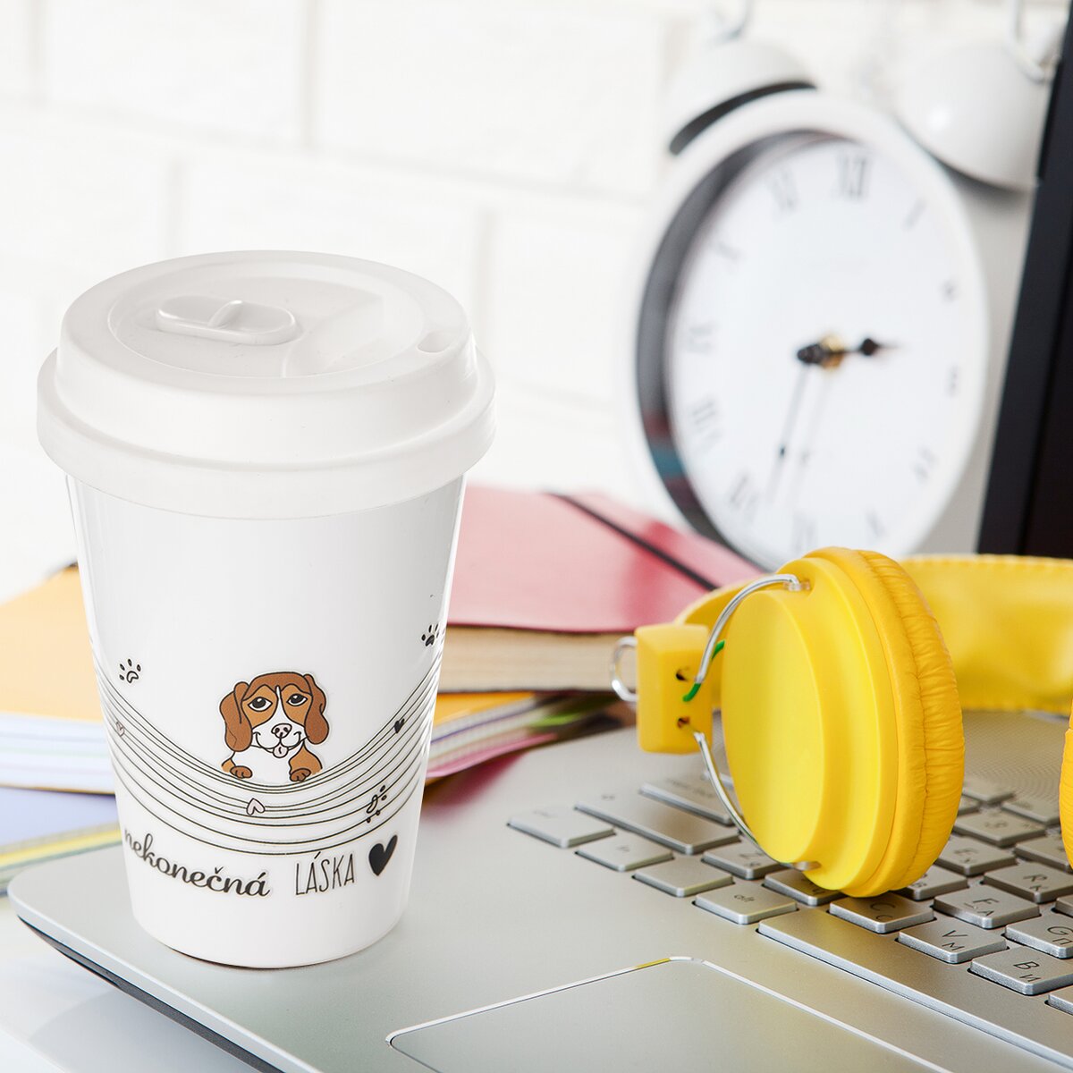 Kód produktu 112270Uzatvárateľný plastový termohrnček s objemom 0,35 l s nápisom NEKONEČNÁ LÁSKA a originálnym dekorom psa.