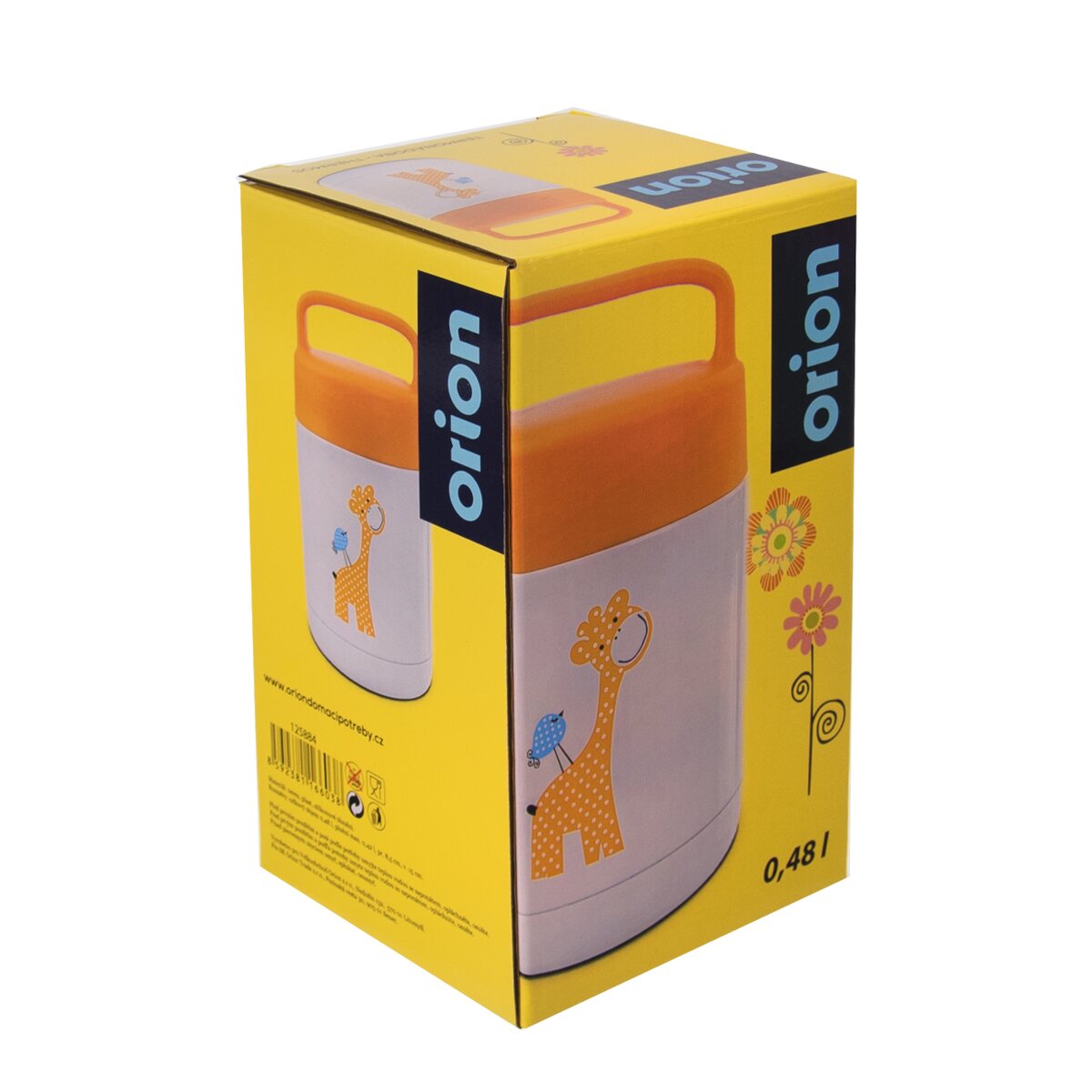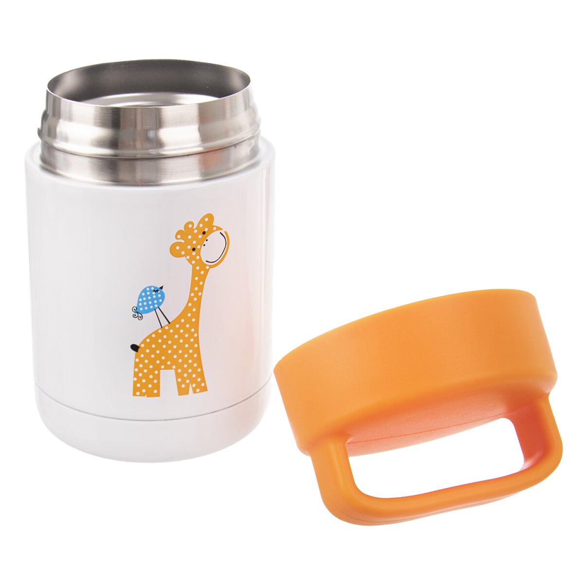 Kód produktu 125884Oranžovobiela termonádoba s objemom 0,48 l v dekore ŽIRAFA. Má aj plastové termo viečko, súčasťou ktorého je ucho slúžiace na prenášanie nádoby.
