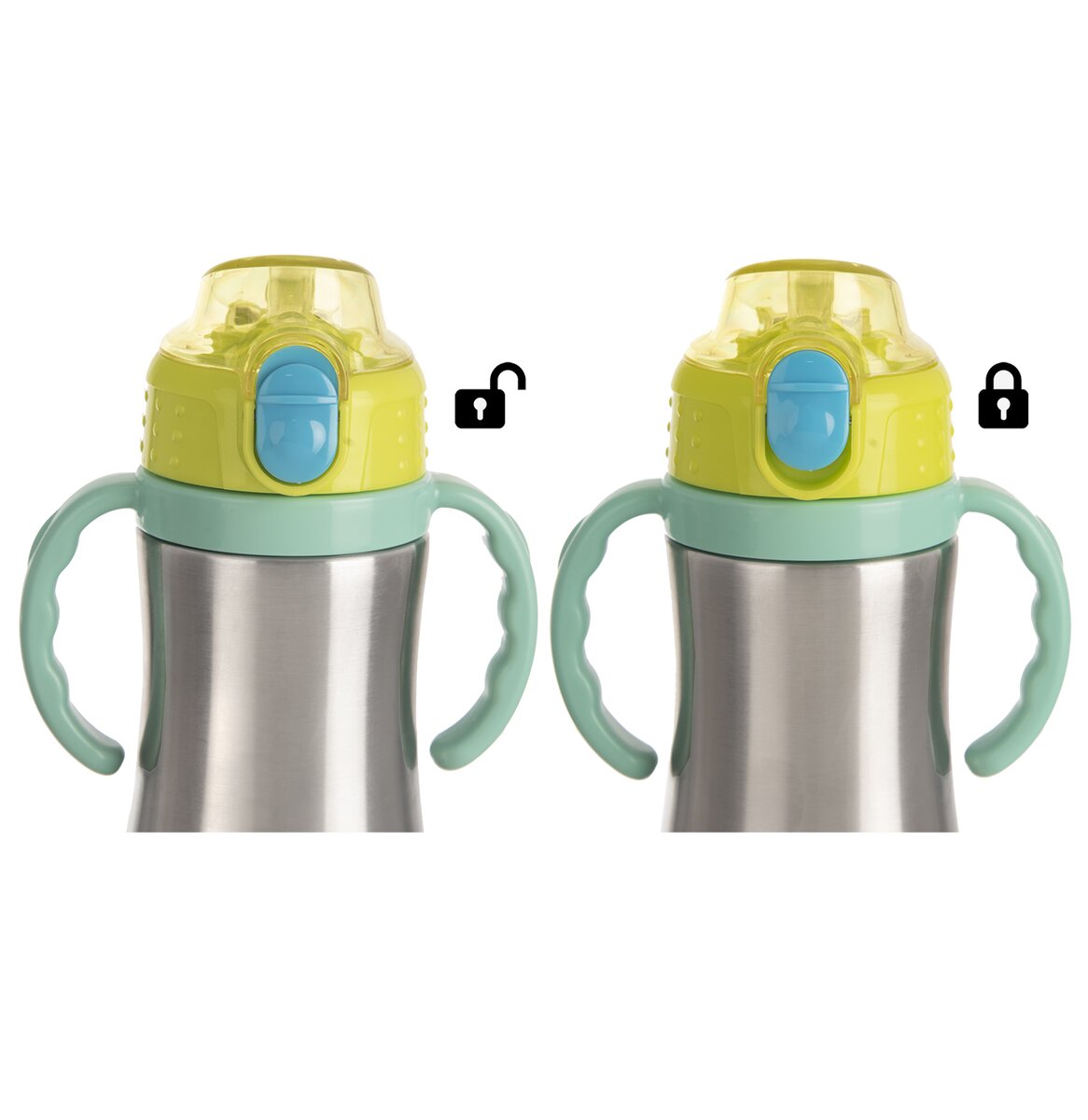 Kód produktu 128517Nerezová dvojstenná termoska s objemom 330 ml udrží nápoje dlho studené alebo teplé. Má transparentné zelené výklopné viečko, silikónové tesnenie a pružnú slamku, čo príde vhod na ihrisku aj výlete. Ľahko sa drží vďaka dvom modrozeleným rukovätiam.