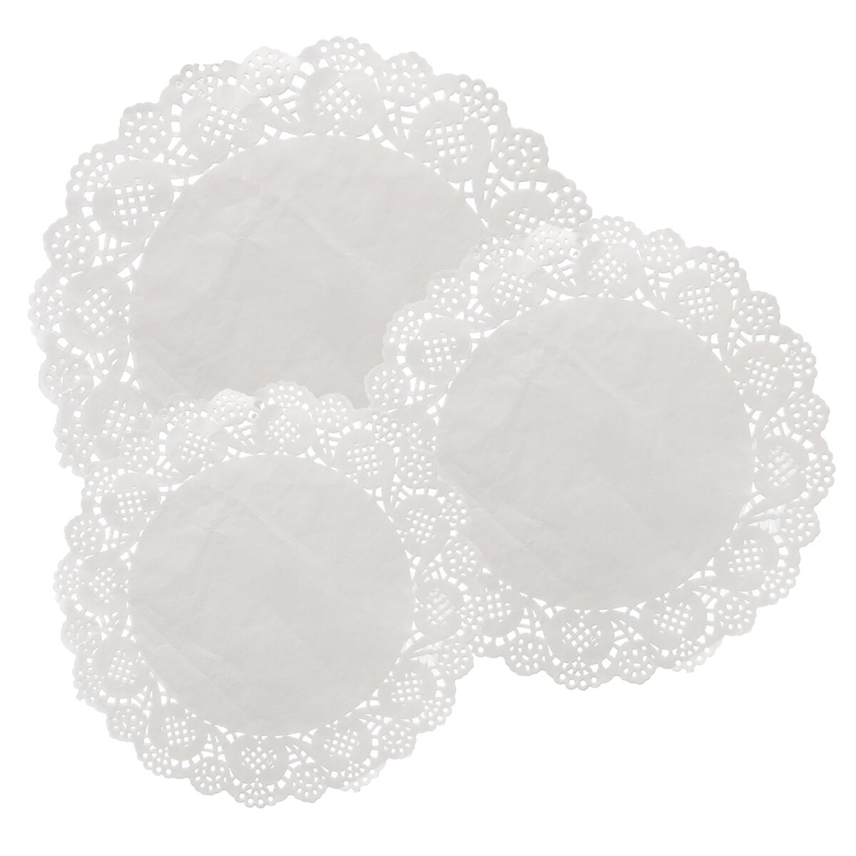 Kód produktu 121566Súprava troch veľkostí bielych papierových podložiek pod tortu, v priemere 21,5, 26 a 30 cm. Zdobená vysekávaným krajkovaným okrajom.