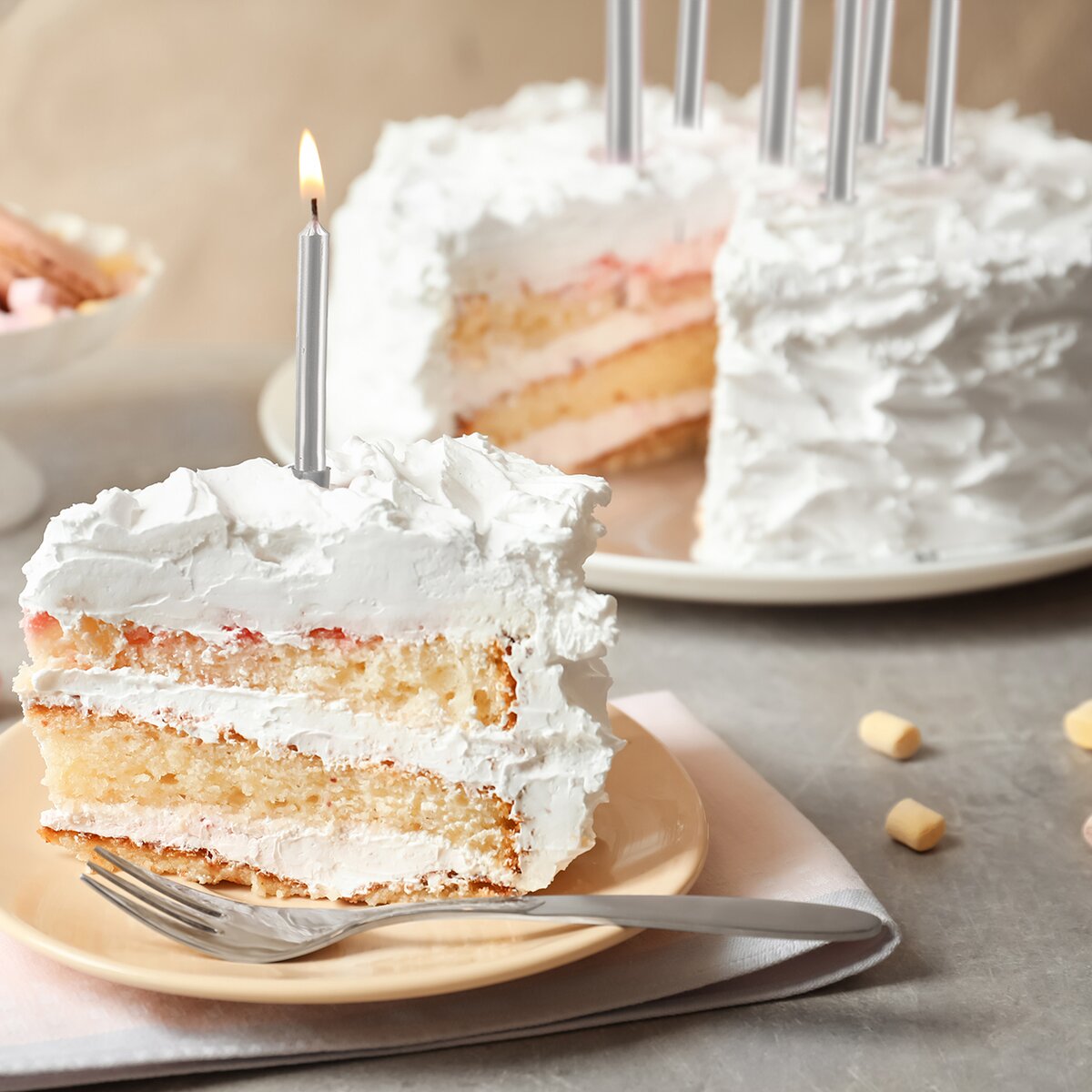 Kód produktu 822252Strieborné tortové sviečky dĺžky 12,5 cm, s nástavcami opatrenými hrotmi, sú neoddeliteľnou súčasťou každej oslavy narodenín či výročia. V balení je 12 tenkých sviečok.