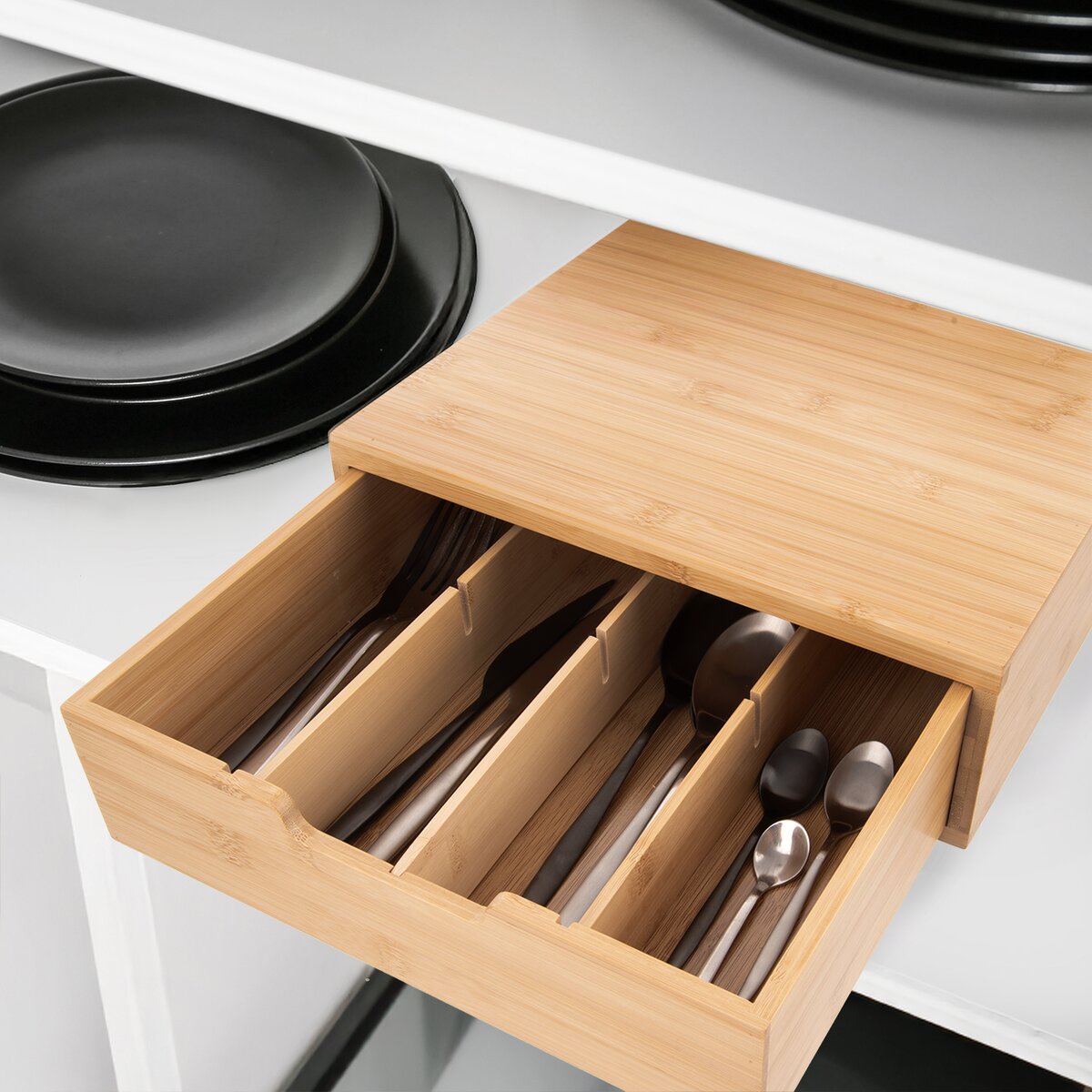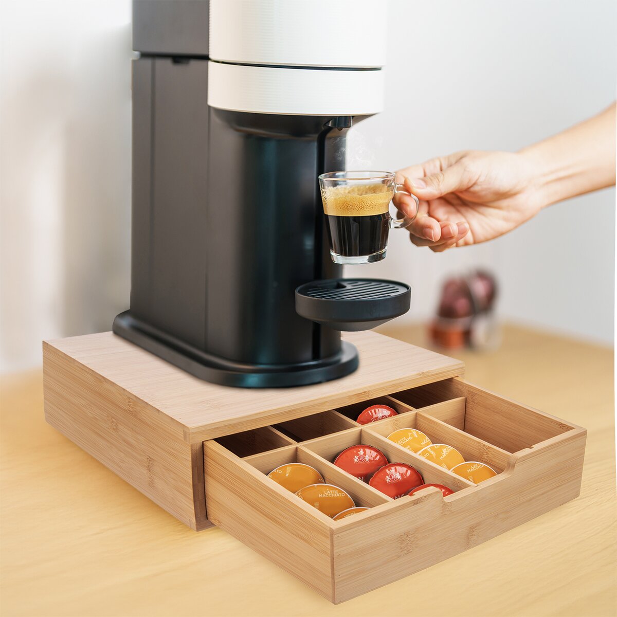 Viac informáciíPokiaľ ste milovníkom kávy a máte doma kávovar na kapsule, určite oceníte praktický box z bambusového dreva. Kávovar naň môžete postaviť a do šuplíka deleného vyberateľnými prepážkami usporiadať jednotlivé druhy kapsúl. Obľúbené kapsule na espresso, cappuccino alebo caffé latté budú vždy po ruke, pekne schované a pritom stačí vnútornú zásuvku vytiahnuť a vybrať si kapsulu podľa chuti.