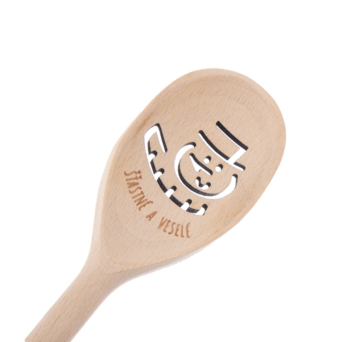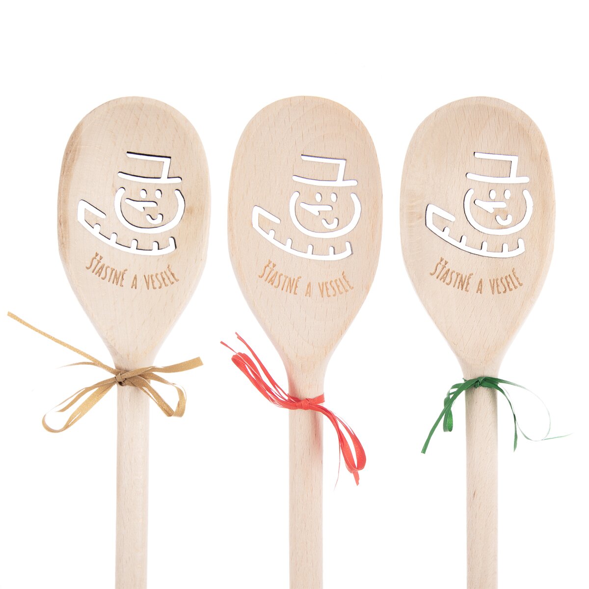 Táto buková vareška je zdobená textom "ŠŤASTNÉ A VESELÉ", nad ktorým je vypaľovaný motív snehuliaka. Ten vznikol v dielni našich dizajnérov.