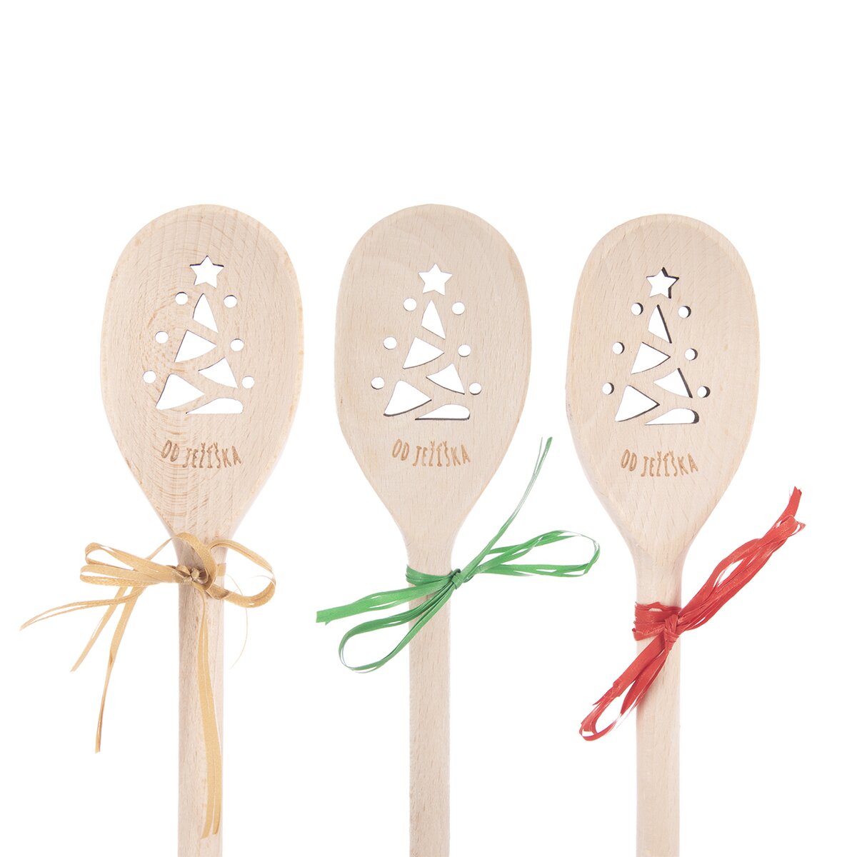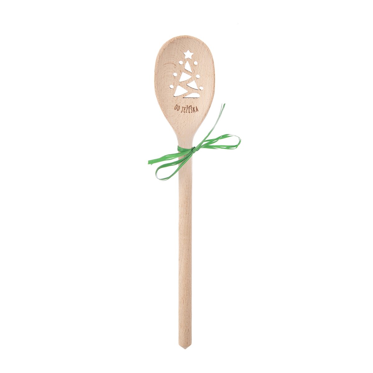 Táto buková vareška je zdobená textom "OD JEŽÍŠKA", nad ktorým je vypaľovaný motív vianočného stromčeka. Ten vznikol v dielni našich dizajnérov.