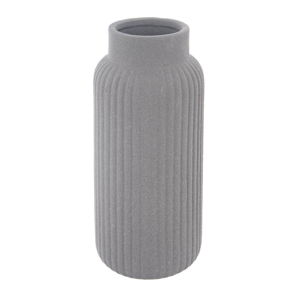 Kód produktu 820185Šedá porcelánová váza s hrubou štruktúrou a pozdĺžnym rebrovaním má výšku 24,5 cm a je vhodná na rezané aj suché kvety alebo dekoratívne trávy a vetvičky.