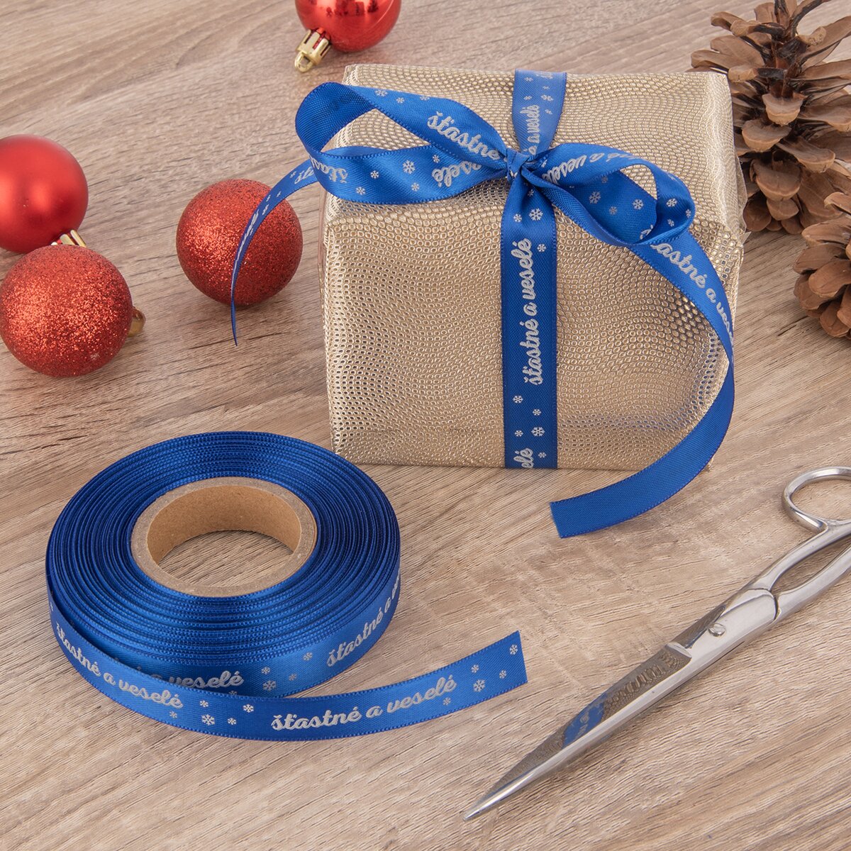 Kód produktu 823105Modrá stuha s potlačou "ŠŤASTNÉ A VESELÉ" je určená na originálne balenie vianočných darčekov alebo na doplnenie najrôznejších vianočných dekorácií. Má dĺžku 25 m.