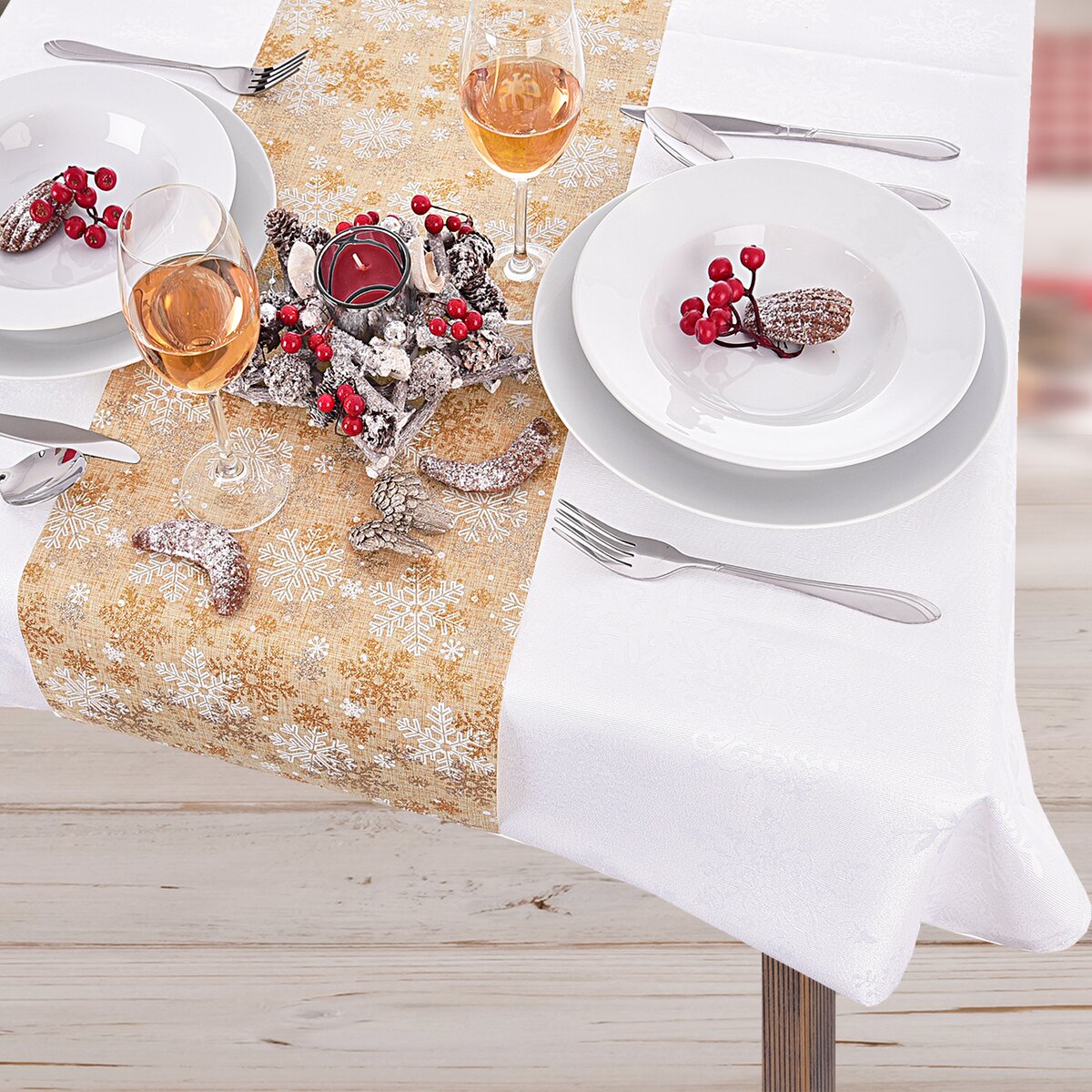 Nielen ku štedrovečernej večeri, ale k tej pravej zimnej, sviatočnej atmosfére, patrí dobré jedlo a slávnostne prestretý stôl. Skúste ho preto ozdobiť týmto obrusom v bielo-striebornej farbe.